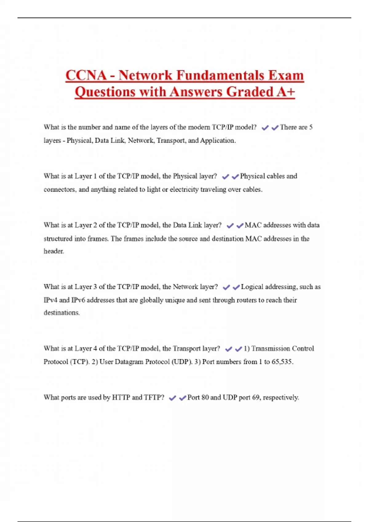 CCNA - Network Fundamentals Exam Questions with Answers Graded A+ What is the number and name of the layers of the modern TCP/IP model? layers - Physical, Data Link, Network, Transport, and Application. What is at Layer 1 of the TCP/IP model, the Physical layer? There are 5 Physical cables and connectors, and anything related to light or electricity traveling over cables. What is at Layer 2 of the TCP/IP model, the Data Link layer? MAC addresses with data structured into frames. The frames include the source and destination MAC addresses in the header. What is at Layer 3 of the TCP/IP model, the Network layer? Logical addressing, such as IPv4 and IPv6 addresses that are globally unique and sent through routers to reach their destinations. What is at Layer 4 of the TCP/IP model, the Transport layer? 1) Transmission Control Protocol (TCP). 2) User Datagram Protocol (UDP). 3) Port numbers from 1 to 65,535.