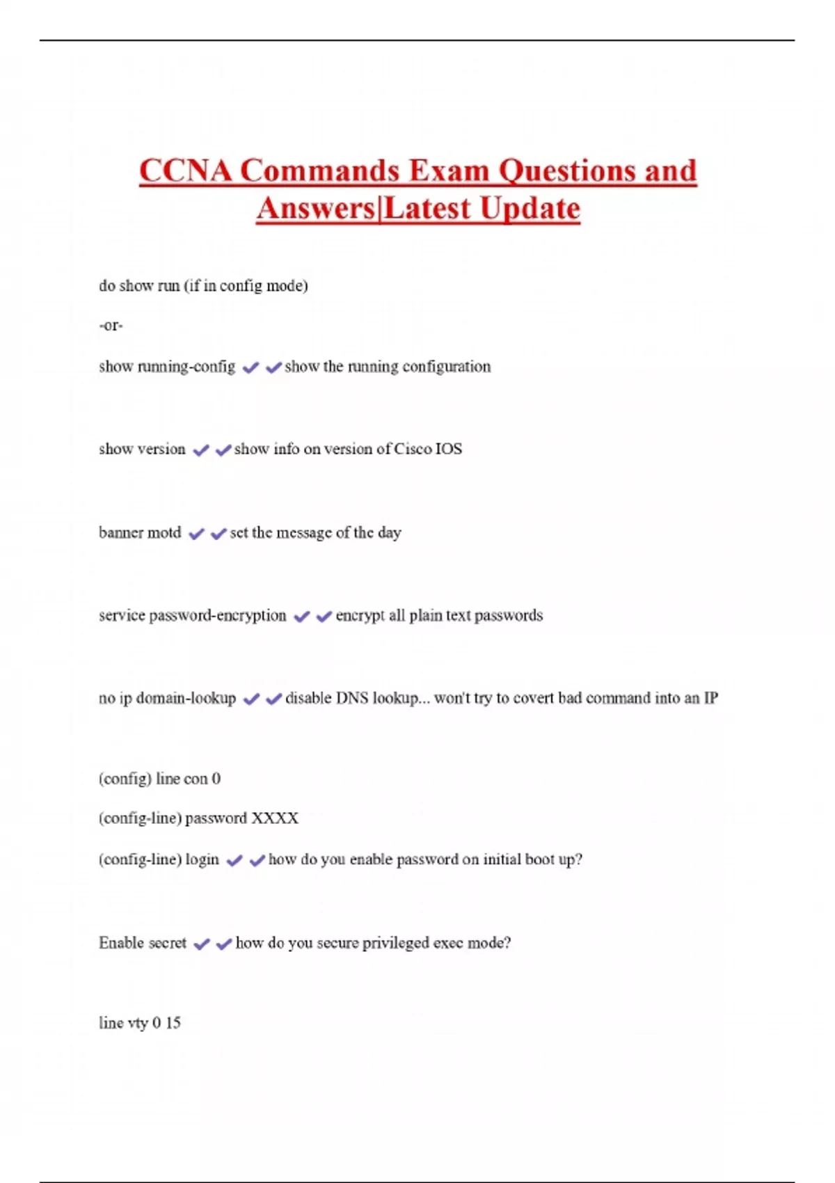 CCNA Commands Exam Questions and Answers|Latest Update do show run (if in config mode) -or- show running-config show version show the running configuration show info on version of Cisco IOS banner motd set the message of the day service password-encryption no ip domain-lookup encrypt all plain text passwords