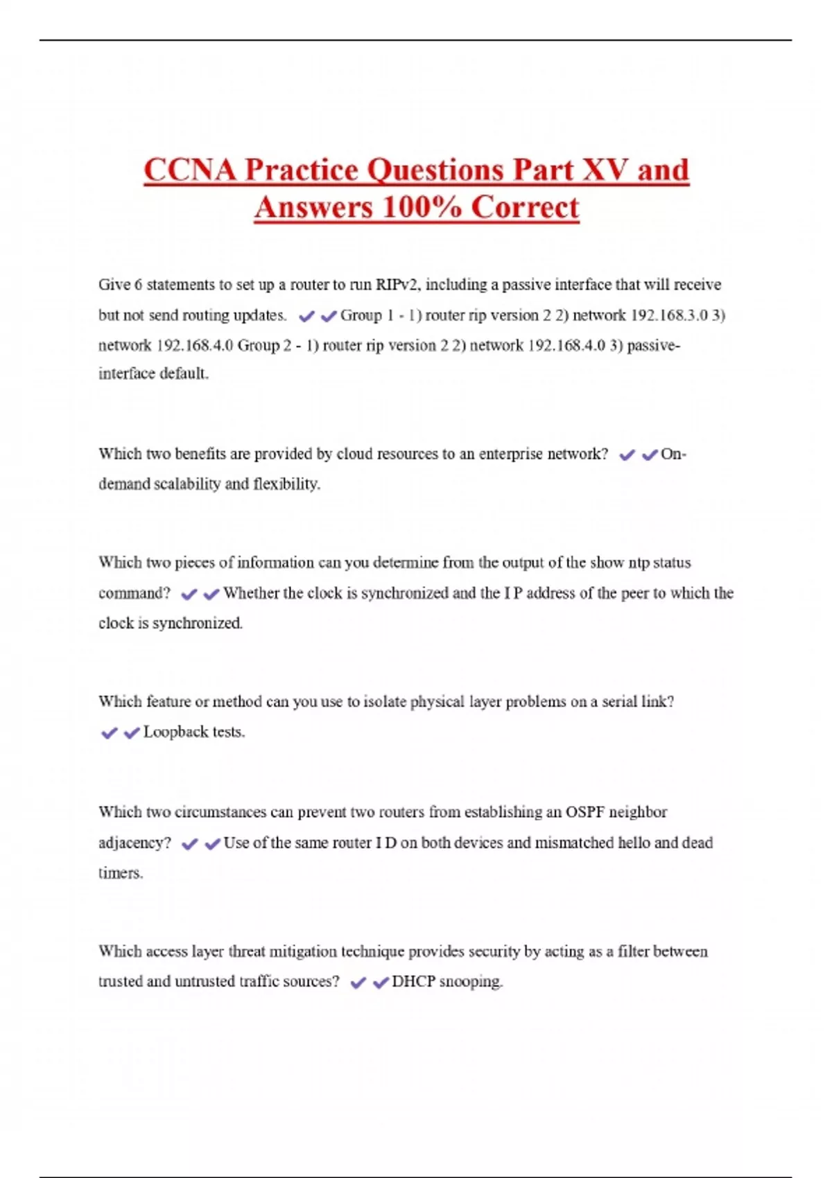 CCNA Practice Questions Part XV and Answers 100% Correct Give 6 statements to set up a router to run RIPv2, including a passive interface that will receive but not send routing updates. Group 1 - 1) router rip version 2 2) network 192.168.3.0 3) network 192.168.4.0 Group 2 - 1) router rip version 2 2) network 192.168.4.0 3) passive interface default. Which two benefits are provided by cloud resources to an enterprise network? demand scalability and flexibility. On Which two pieces of information can you determine from the output of the show ntp status command? Whether the clock is synchronized and the I P address of the peer to which the clock is synchronized. Which feature or method can you use to isolate physical layer problems on a serial link? Loopback tests