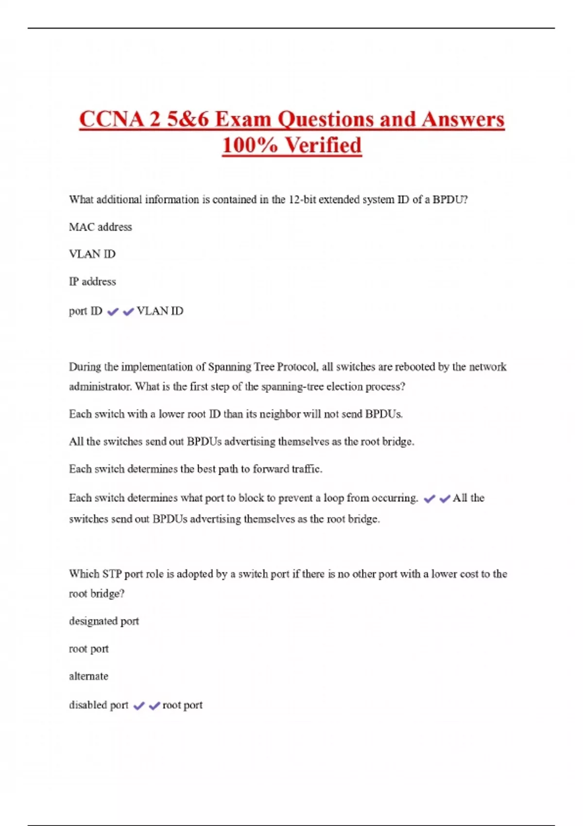 CCNA 2 5&6 Exam Questions and Answers 100% Verified What additional information is contained in the 12-bit extended system ID of a BPDU? MAC address VLAN ID IP address port ID VLAN ID During the implementation of Spanning Tree Protocol, all switches are rebooted by the network administrator. What is the first step of the spanning-tree election process? Each switch with a lower root ID than its neighbor will not send BPDUs. All the switches send out BPDUs advertising themselves as the root bridge. Each switch determines the best path to forward traffic. Each switch determines what port to block to prevent a loop from occurring. switches send out BPDUs advertising themselves as the root bridge.