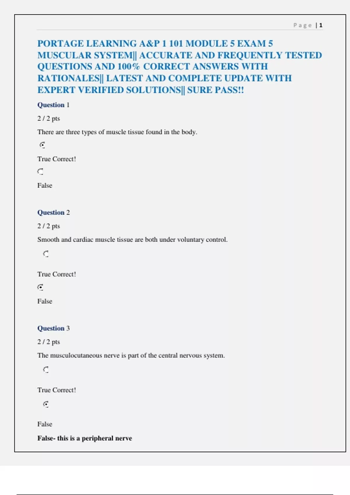 PORTAGE LEARNING A&P 1 101 MODULE 5 EXAM 5 MUSCULAR SYSTEM|| ACCURATE AND FREQUENTLY TESTED QUESTIONS AND 100% CORRECT ANSWERS WITH RATIONALES|| LATEST AND COMPLETE UPDATE WITH EXPERT VERIFIED SOLUTIONS|| SURE PASS!!