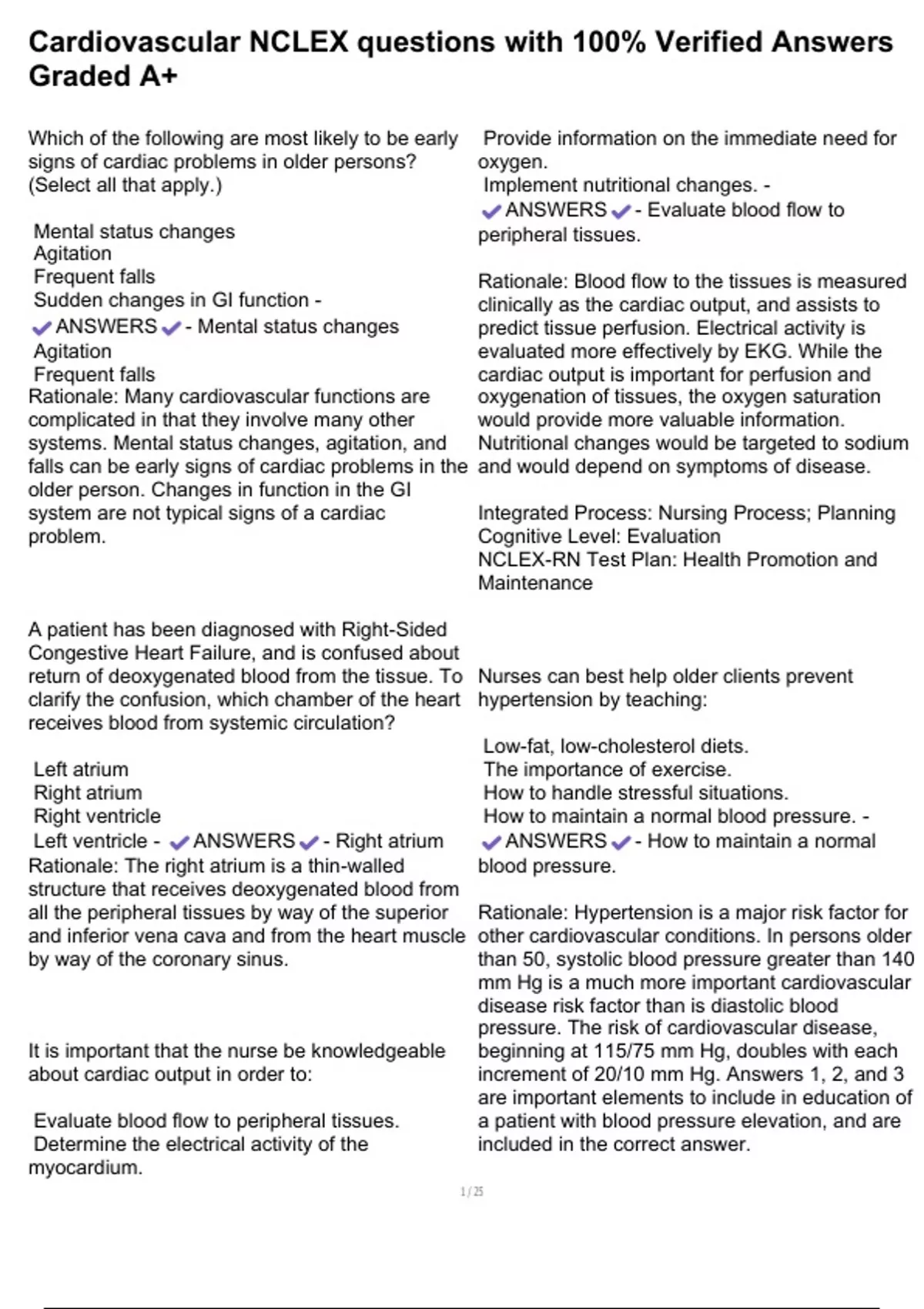 , Cardiovascular NCLEX questions with 100% Verified Answers