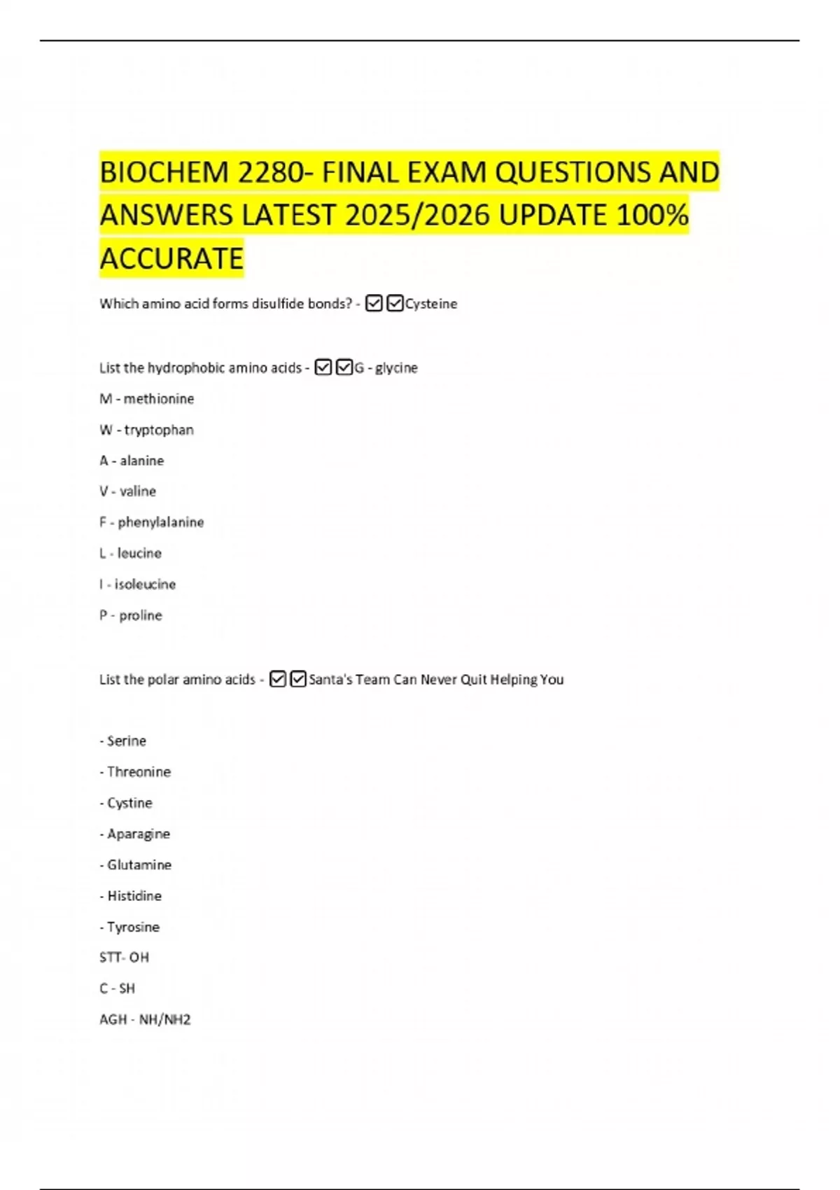 BIOCHEM 2280- FINAL EXAM QUESTIONS AND ANSWERS LATEST 2025/2026 UPDATE 100% ACCURATE