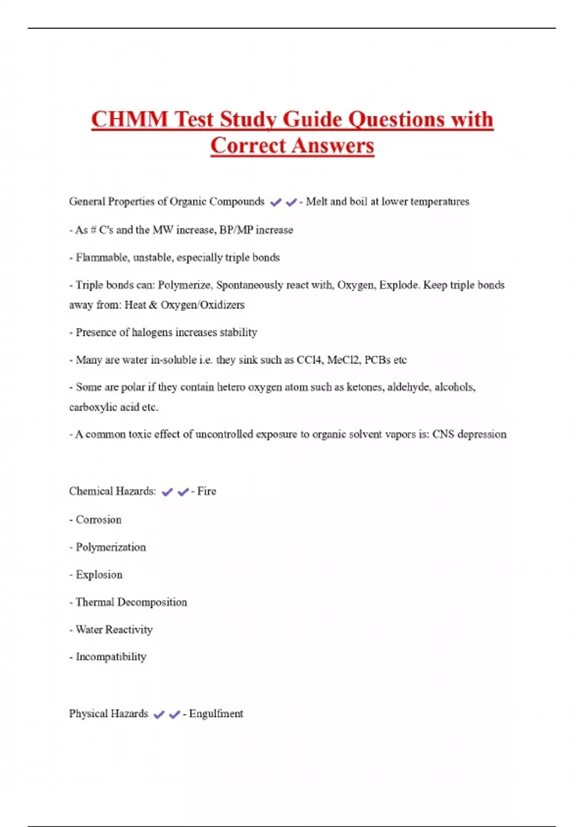 CHMM Test Study Guide Questions with Correct Answers General Properties of Organic Compounds - As # C's and the MW increase, BP/MP increase - Flammable, unstable, especially triple bonds - Melt and boil at lower temperatures - Triple bonds can: Polymerize, Spontaneously react with, Oxygen, Explode. Keep triple bonds away from: Heat & Oxygen/Oxidizers - Presence of halogens increases stability - Many are water in-soluble i.e. they sink such as CCl4, MeCl2, PCBs etc - Some are polar if they contain hetero oxygen atom such as ketones, aldehyde, alcohols, carboxylic acid etc. - A common toxic effect of uncontrolled exposure to organic solvent vapors is: CNS depression