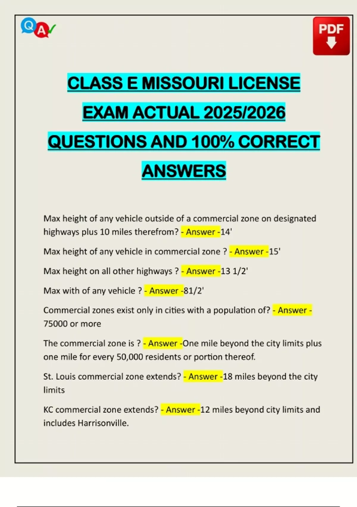 CLASS E MISSOURI LICENSE EXAM ACTUAL 2025/2026 QUESTIONS AND 100% CORRECT ANSWERS Max height of any vehicle outside of a commercial zone on designated highways plus 10 miles therefrom? - Answer -14' Max height of any vehicle in commercial zone ? - Answer -15' Max height on all other highways ? - Answer -13 1/2' Max with of any vehicle ? - Answer -81/2' Commercial zones exist only in cities with a population of? - Answer - 75000 or more The commercial zone is ? - Answer -One mile beyond the city limits plus one mile for every 50,000 residents or portion thereof. St. Louis commercial zone extends? - Answer -18 miles beyond the city limits
