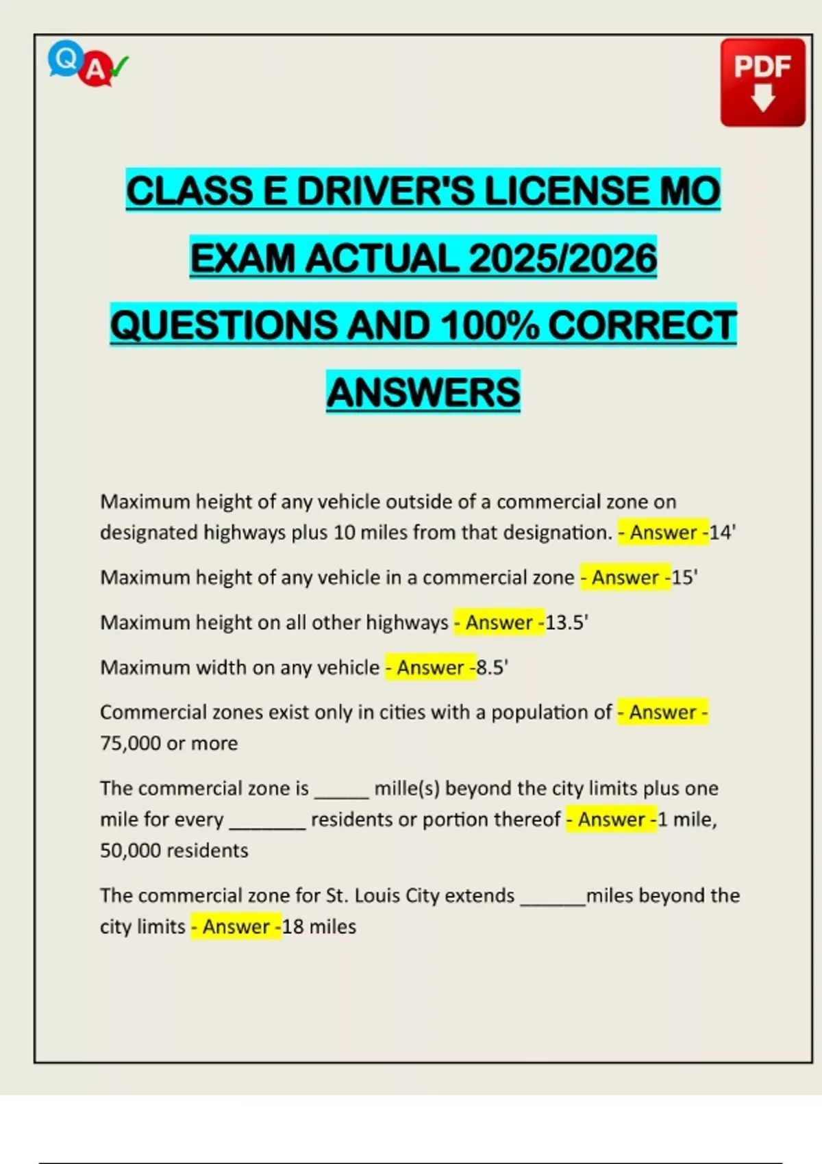 CLASS E DRIVER'S LICENSE MO EXAM ACTUAL 2025/2026 QUESTIONS AND 100% CORRECT ANSWERS Maximum height of any vehicle outside of a commercial zone on designated highways plus 10 miles from that designation. - Answer -14' Maximum height of any vehicle in a commercial zone - Answer -15' Maximum height on all other highways - Answer -13.5' Maximum width on any vehicle - Answer -8.5' Commercial zones exist only