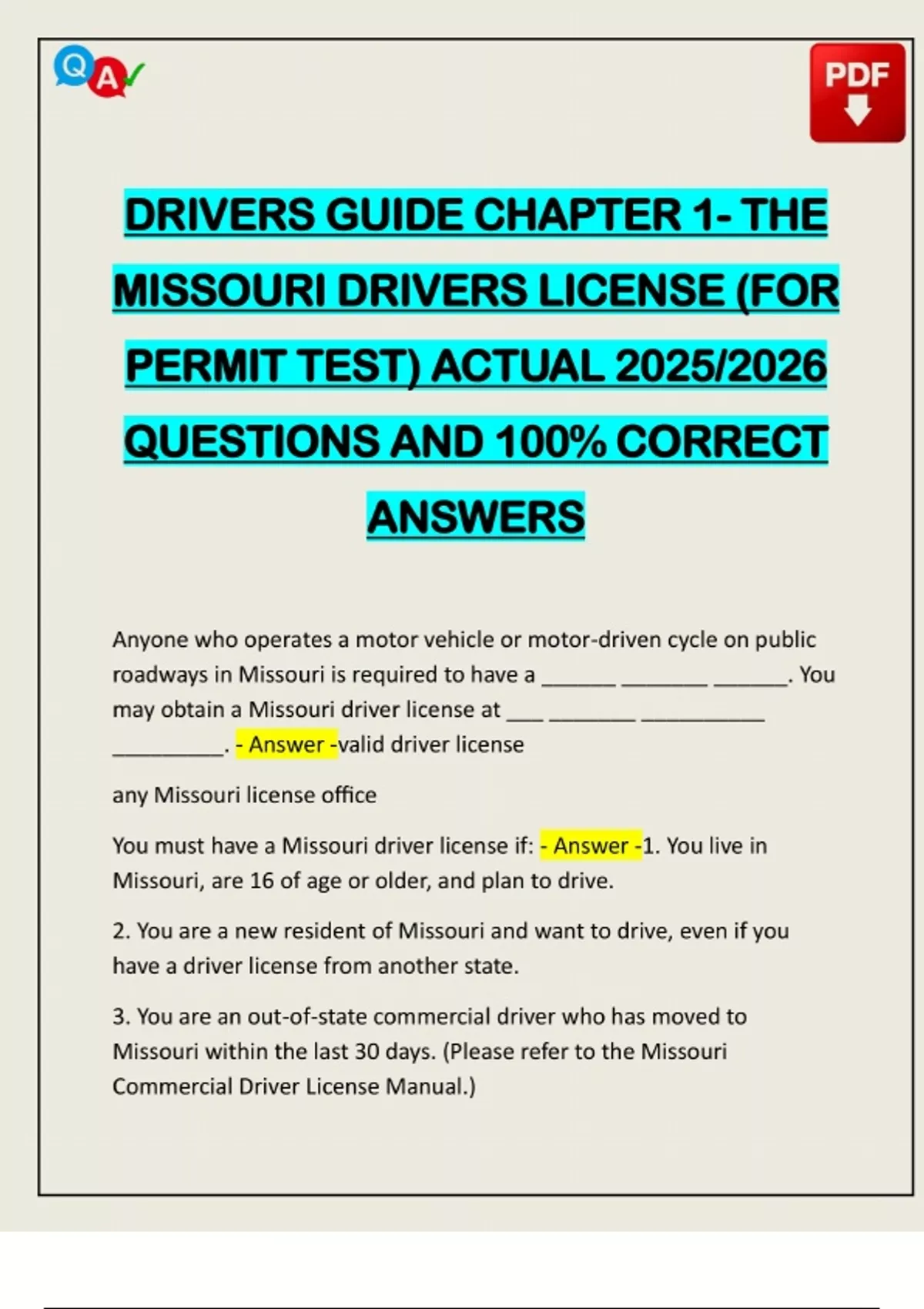 DRIVERS GUIDE CHAPTER 1- THE MISSOURI DRIVERS LICENSE (FOR PERMIT TEST) ACTUAL 2025/2026 QUESTIONS AND 100% CORRECT ANSWERS Anyone who operates a motor vehicle or motor-driven cycle on public roadways in Missouri is required to have a ______ _______ ______. You may obtain a Missouri driver license at ___ _______ __________ _________. - Answer -valid driver license any Missouri license office You must have a Missouri driver license if: - Answer -1. You live in Missouri, are 16 of a
