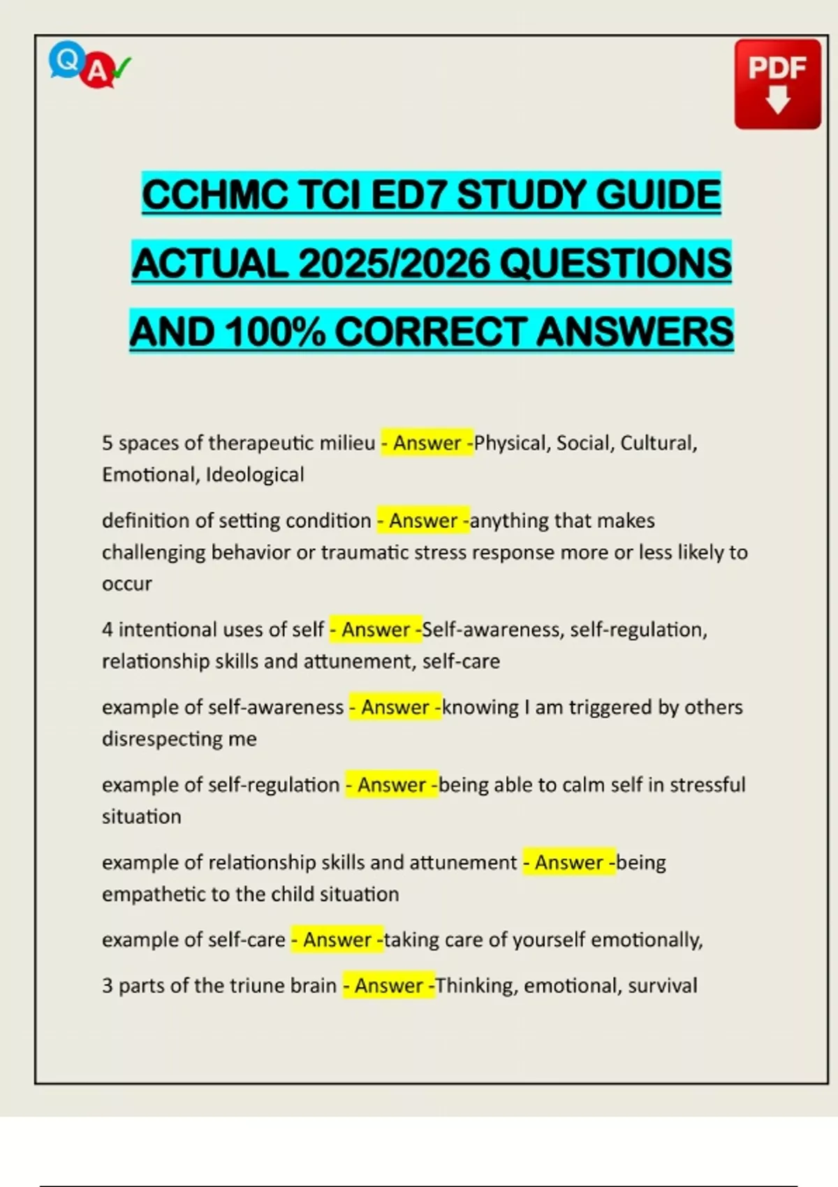 CCHMC TCI ED7 STUDY GUIDE ACTUAL 2025/2026 QUESTIONS AND 100% CORRECT ANSWERS 5 spaces of therapeutic milieu - Answer -Physical, Social, Cultural, Emotional, Ideological definition of setting condition - Answer -anything that makes challenging behavior or traumatic stress response more or less likely to occur 4 intentional uses of self - Answer -Self-awareness, self-regulation, relationship skills and attunement, self-care example of self-awareness - Answer -knowing I am triggered by others disrespecting me example of self-regulation - Answer -being able to calm self in stressful situation