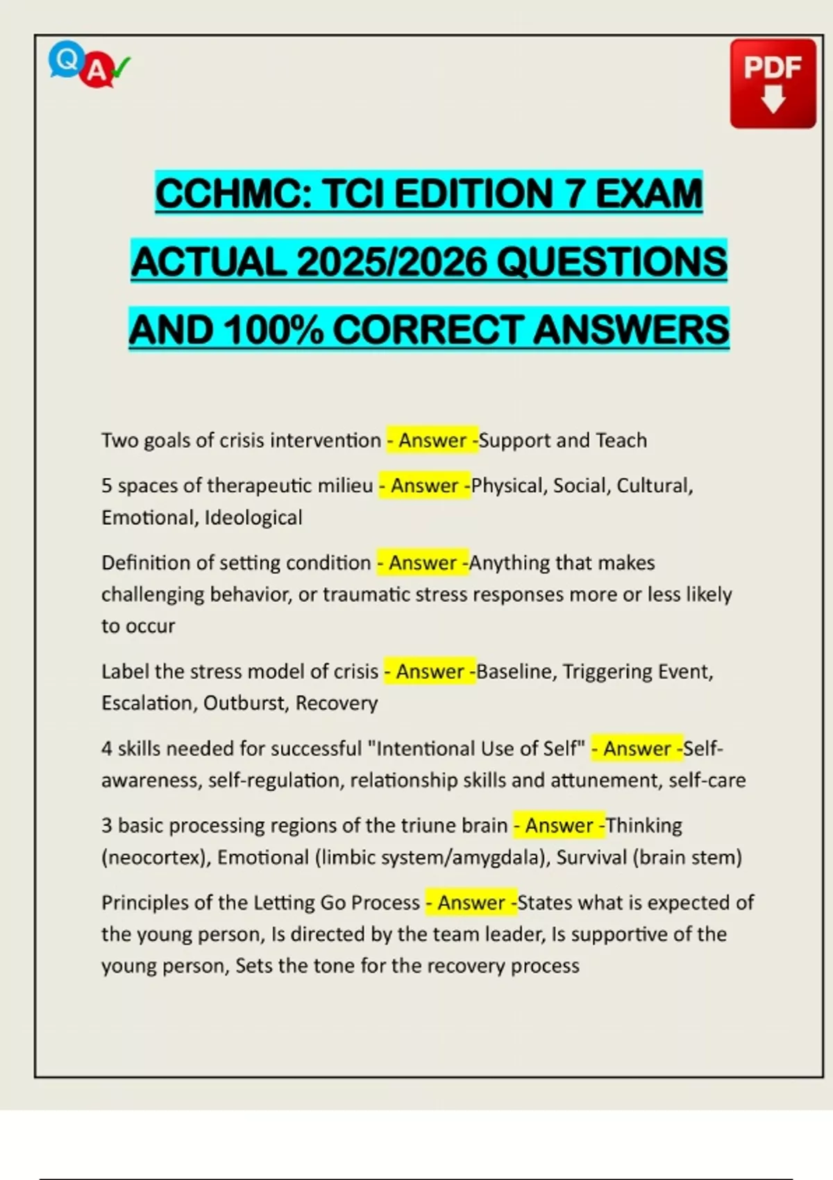 CCHMC: TCI EDITION 7 EXAM ACTUAL 2025/2026 QUESTIONS AND 100% CORRECT ANSWERS Two goals of crisis intervention - Answer -Support and Teach 5 spaces of therapeutic milieu - Answer -Physical, Social, Cultural, Emotional, Ideological Definition of setting condition - Answer -Anything that makes challenging behavior, or traumatic stress responses more or less likely to occur Label the stress model of crisis - Answer -Baseline, Triggering Event, Escalation, Outburst, Recovery 4 skills needed for successful "Intentional Use of Self" - Answer -Selfawareness, self-regulation, relationship skills and attunement, self-care 3 basic processing regions of the triune brain - Answer -Thinking (neocortex), Emotional (limbic system/amygdala), Survival (brain stem) Principles of the Letting Go Process - Answer -