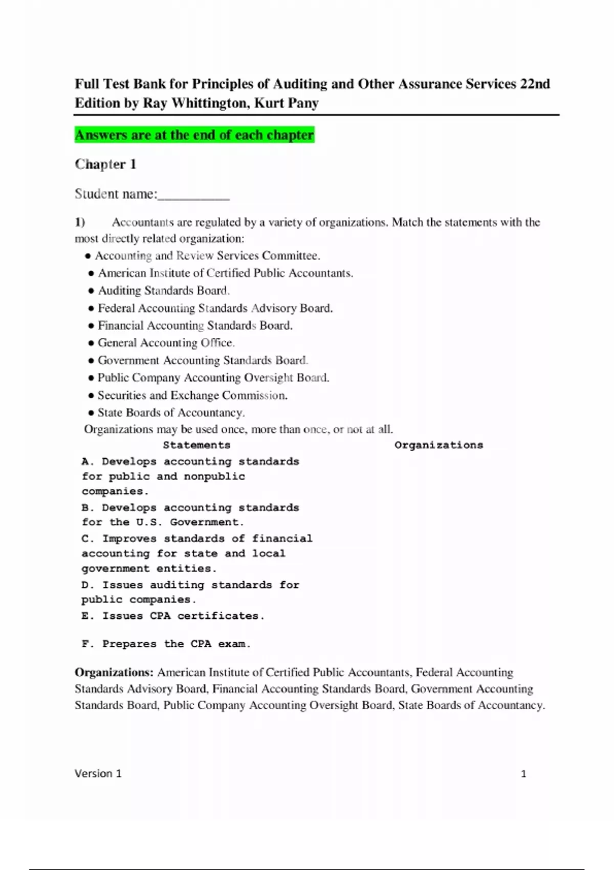 TEST BANK For Principles of Auditing and Other Assurance Services 22nd Edition by Ray Whittington, Kurt Pany Chapters 1-21 Complete Guide.