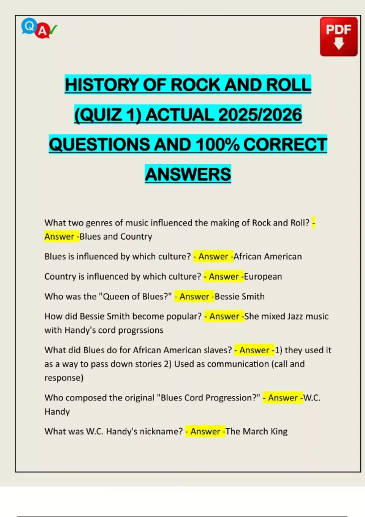 HISTORY OF ROCK AND ROLL (QUIZ 1) ACTUAL 2025/2026 QUESTIONS AND 100% CORRECT ANSWERS What two genres of music influenced the making of Rock and Roll? - Answer -Blues and Country Blues is influenced by which culture? - Answer -African American Country is influenced by which culture? - Answer -European Who was the "Queen of Blues?" - Answer -Bessie Smith How did Bessie Smith become popular? - Answer -She mixed Jazz music with Handy's cord progrssions What did Blues do for African American slaves? - Answer -1) they used it as a way to pass down stories 2) Used as communication (call and response)