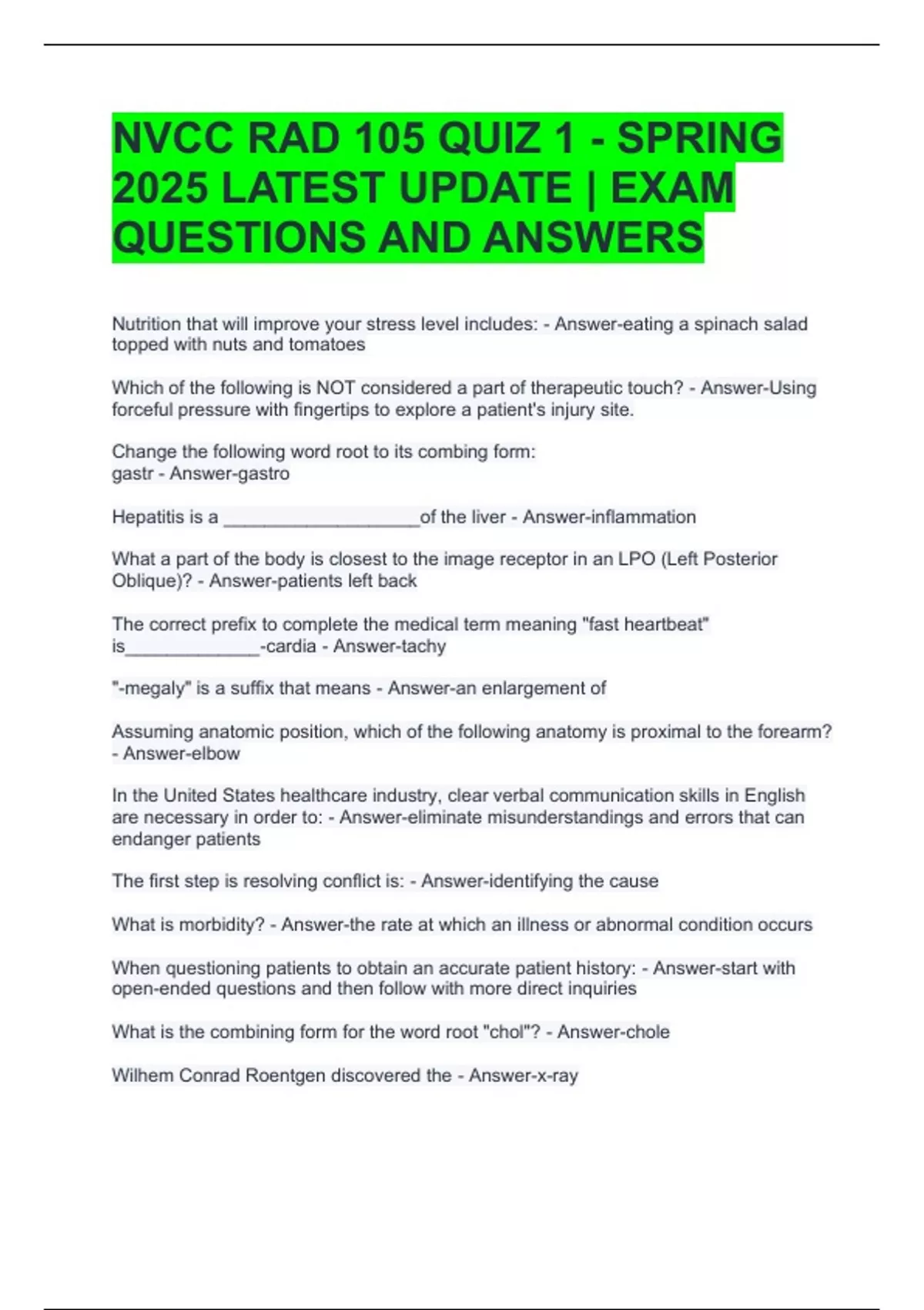 NVCC RAD 105 QUIZ 1 - SPRING 2025 LATEST UPDATE | EXAM QUESTIONS AND ANSWERS