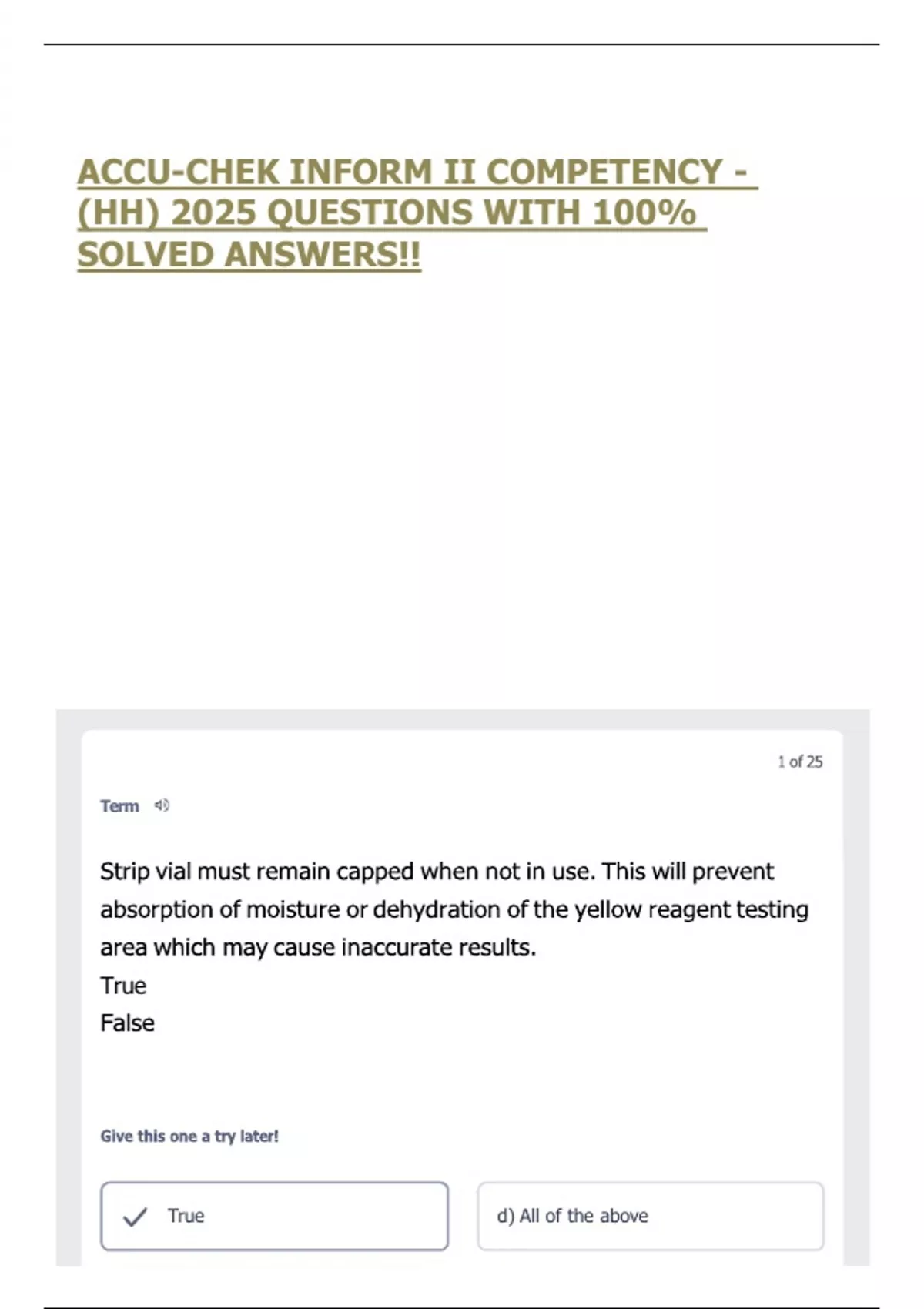 ACCU-CHEK INFORM II COMPETENCY - (HH) 2025 QUESTIONS WITH 100% SOLVED ANSWERS!!