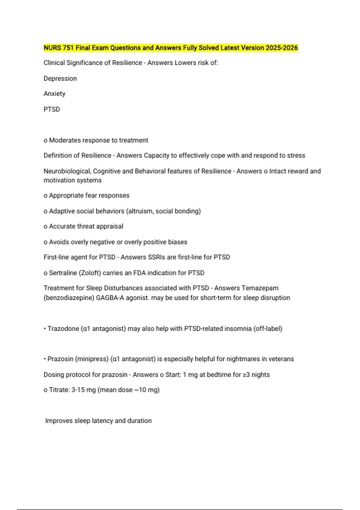NURS 751 Final Exam Questions and Answers Fully Solved Latest Version Clinical Significance of Resilience - Answers Lowers risk of: Depression Anxiety PTSD o Moderates response to treatment Definition of Resilience - Answers Capacity to effectively cope with and respond to stress Neurobiological, Cognitive and Behavioral features of Resilience - Answers o Intact reward and motivation systems o Appropriate fear responses o Adaptive social behaviors (altruism, social bonding) o Accurate threat appraisal o Avoids overly negative or overly positive biases First-line agent for PTSD - Answers SSRIs are first-line for PTSD o Sertraline (Zoloft) carries an FDA indication for PTSD Treatment for Sleep Disturbances associated with PTSD - Answers Temazepam (benzodiazepine) GAGBA-A agonist. may be used for short-term for sleep disruption • Trazodone (α1 antagonist) may also help with PTSD-related insomnia (off-label) • Prazosin (minipress) (α1 antagonist) is especially helpful for nightmares in veterans Dosing protocol for prazosin - Answers o Start: 1 mg at bedtime for ≥3 nights o Titrate: 3-15 mg (mean dose ~10 mg) Improves sleep latency and duration What is used for adrenergic modulation in PTSD? - Answers Propranolol (beta blocker) What to know about Propanolol for PTSD? - Answers Beta Blocker may prevent PTSD if given early o Crosses blood-brain barrier → blunts adrenergic overconsolidation of trauma memory o Most effective if initiated within 6-24 hours of trauma o Typical dose: 40 mg TID to QID for 7-10 days NNT- 6-8. (experimental) NNH- 50+ (bradycardia, fatigue) What is used to treat hyperarousal in PTSD? - Answers Clonidine and Guanfacine o Avoid abrupt withdrawal → rebound hypertension (especially with clonidine) • Clonidine: binds to α2A, α2B, α2C → more sedating (reduces hyperarousal and sympathetic tone) • Guanfacine: more selective for α2A → less sedation (improves sleep and emotional regulation) Study based dosing recommendations for Hydrocortisone in treating PTSD - Answers 100 mg hydrocortisone IV TID for 5 days post-op 100-140 mg/day hydrocortisone for 10 days post-trauma A single 100 mg IV dose of hydrocortisone administered within 6 hours of trauma was associated with reduced intrusive memories and lower CAPS scores at 1 month. 20-30 mg PO BID x 10 days starting within 12 hours of trauma reduced PTSD symptoms and decreased emotional memory consolidation. what to know about hydrocortisone for PTSD - Answers preventative use