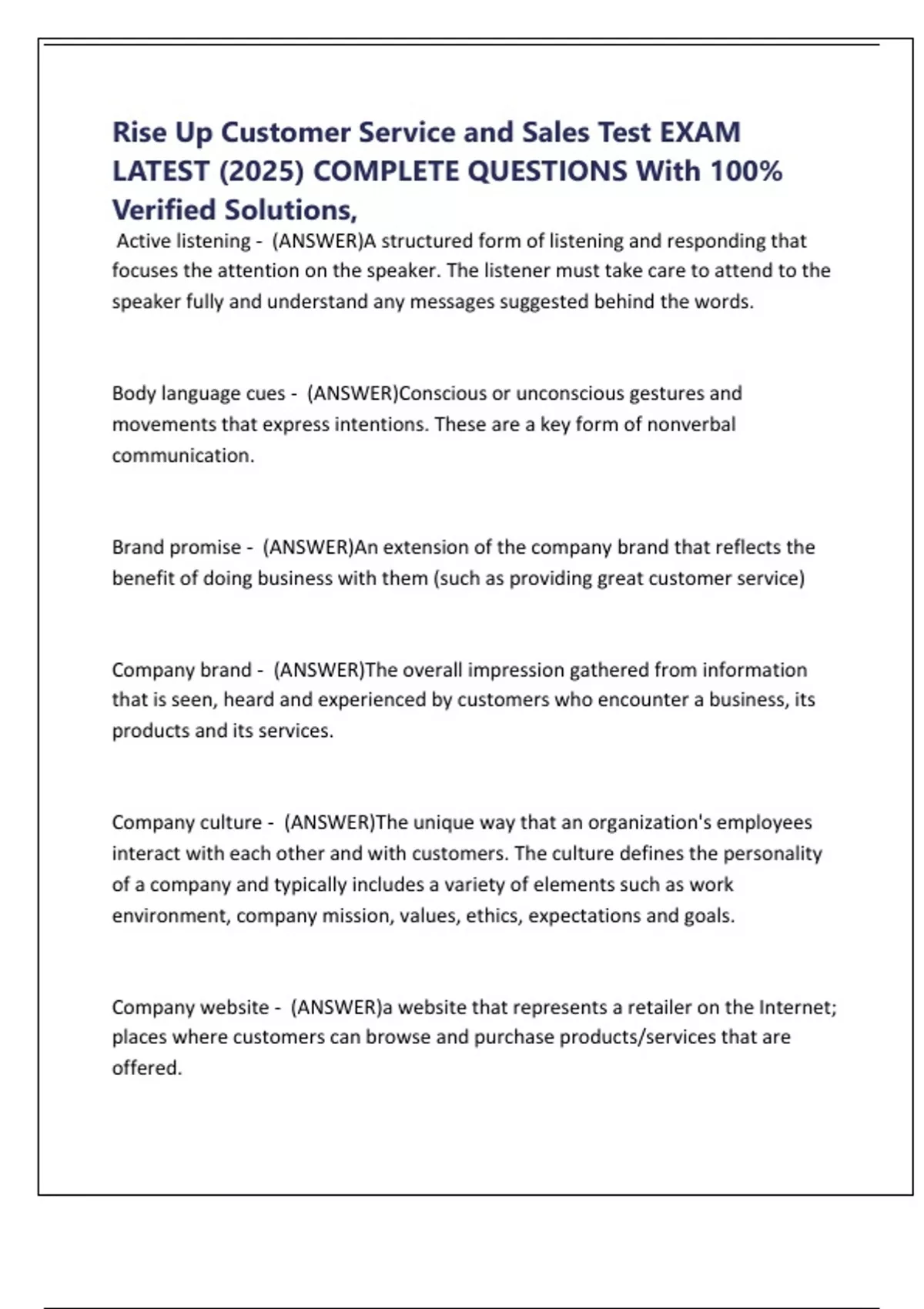 Rise Up Customer Service and Sales Test EXAM