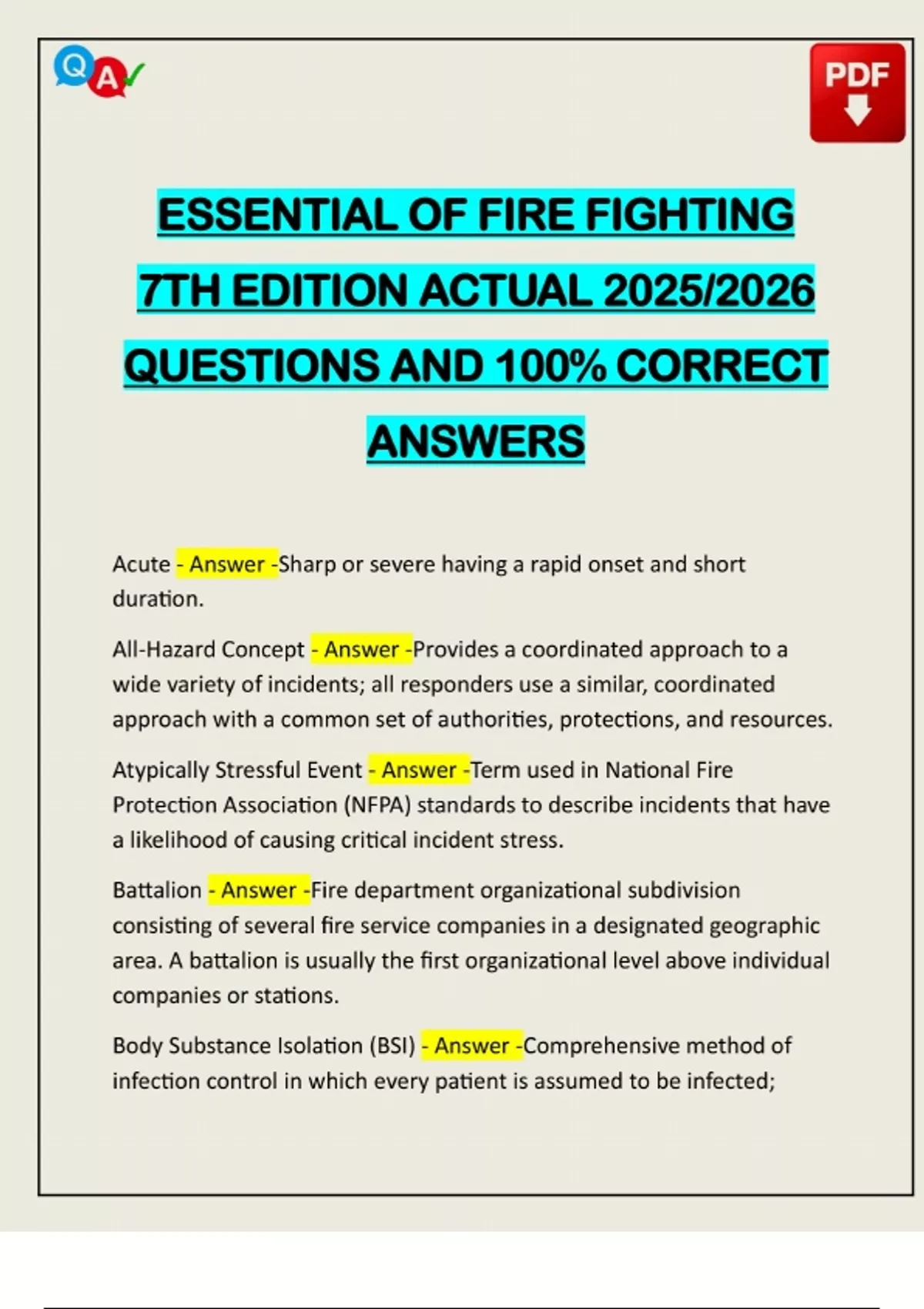 ESSENTIAL OF FIRE FIGHTING 7TH EDITION ACTUAL 2025/2026 QUESTIONS AND 100% CORRECT ANSWERS Acute - Answer -Sharp or severe having a rapid onset and short duration. All-Hazard Concept - Answer -Provides a coordinated approach to a wide variety of incidents; all responders use a similar, coordinated approach with a common set of authorities, protections, and resources. Atypically Stressful Event - Answer -Term used in National Fire Protection Association (NFPA) standards to describe incidents that have a likelihood of causing critical incident stress. Battalion - Answer -Fire department organizational subdivision consisting of several fire service companies in a designated geographic area. A battalion is usually the first organizational level above individual companies or stations. Body Substance Isolation (BSI) - Ans
