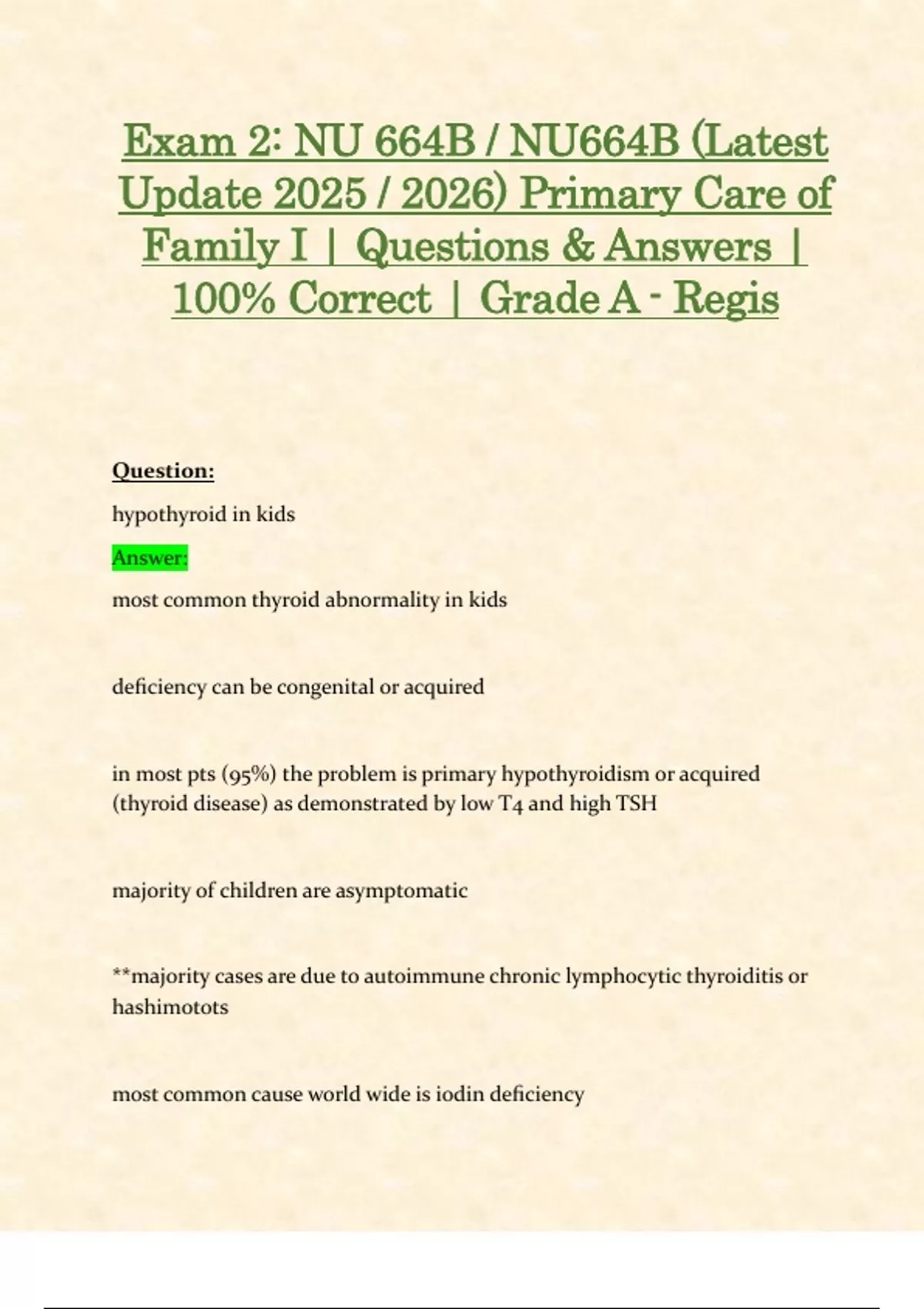 Exam 2: NU 664B / NU664B (Latest Update 2025 / 2026) Primary Care of Family I | Questions & Answers | 100% Correct | Grade A - Regis Question: hypothyroid in kids Answer: most common thyroid abnormality in kids deficiency can be congenital or acquired in most pts (95%) the problem is primary hypothyroidism or acquired (thyroid disease) as demonstrated by low T4 and high TSH majority of children are asymptomatic **majority cases are due to autoimmune chronic lymphocytic thyroiditis or hashimotots most common cause world wide is iodin deficiency Question: clinical manifestations of hypothyroid in kids Answer: declining growth velocity/ short stature. usually insidious in onset over years before other sx if they occur at all. skeletal maturity delayed too so bone age will be delayed abnormal pubertal development, delayed decreased functioning in school, decreased energy other symptoms