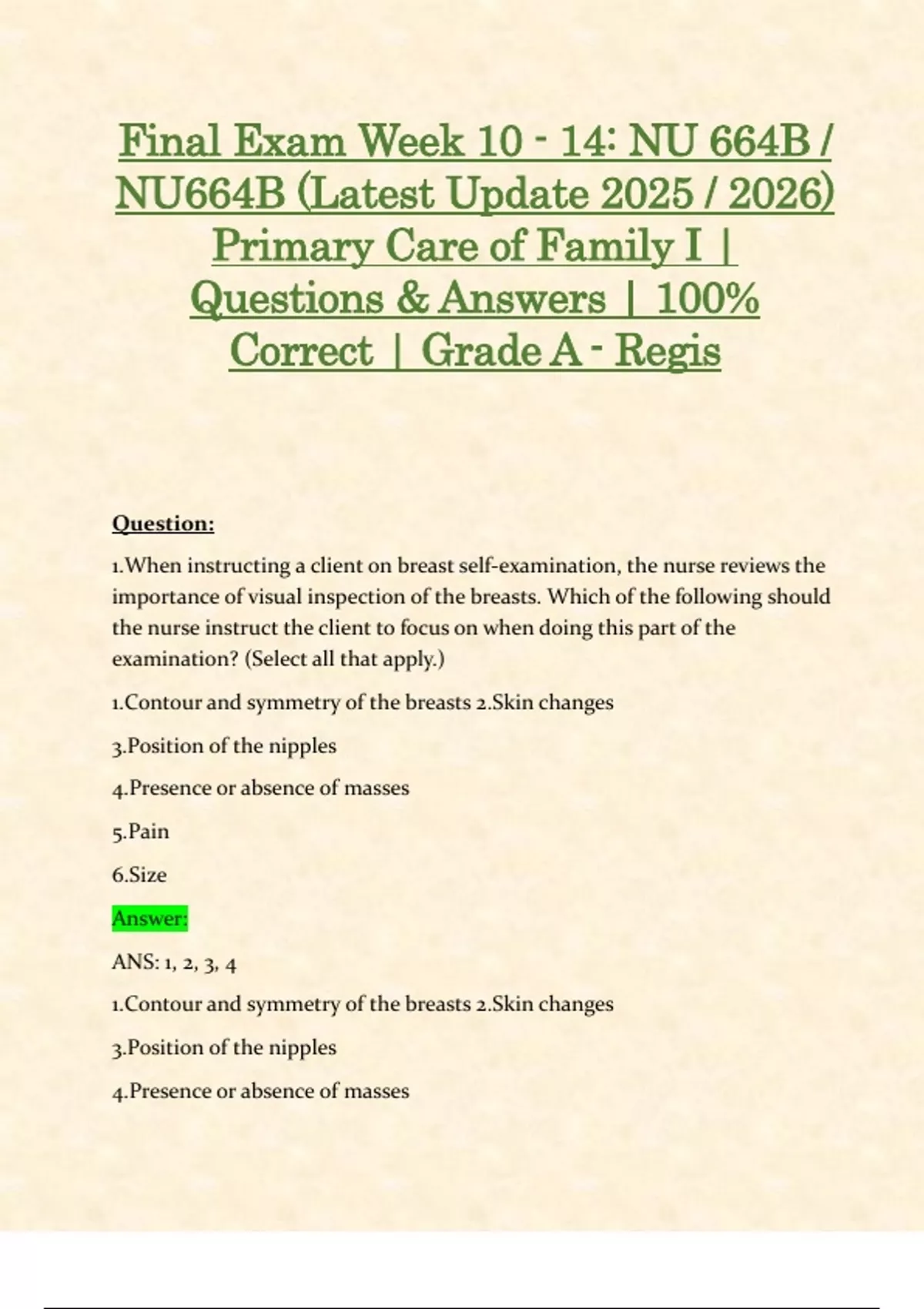 Final Exam Week 10 - 14: NU 664B / NU664B (Latest Update 2025 / 2026) Primary Care of Family I | Questions & Answers | 100% Correct | Grade A - Regis Question: 1.When instructing a client on breast self-examination, the nurse reviews the importance of visual inspection of the breasts. Which of the following should the nurse instruct the client to focus on when doing this part of the examination? (Select all that apply.) 1.Contour and symmetry of the breasts 2.Skin changes 3.Position of the nipples 4.Presence or absence of masses 5.Pain 6.Size Answer: ANS: 1, 2, 3, 4 1.Contour and symmetry of the breasts 2.Skin changes 3.Position of the nipples 4.Presence or absence of masses Visual inspection of the breast self-examination focuses on the contour and symmetry of the breasts; skin changes such as scaling, puckering, dimpling, or scars; the position of the nipples; nipple discharge or retraction; and presence or absence of masses. This part of the examination does not include pain or size of the breasts. Question: 2.The nurse is preparing to assess a clients nipples during a breast examination. Which of the following are considered pathological conditions that affect the nipple? (Select all that apply.) 1.Bleeding 2.Lumps 3.Discharge 4.Scars 5.Fissures 6.Large size Answer: 1.Bleeding 3.Discharge 5.Fissures