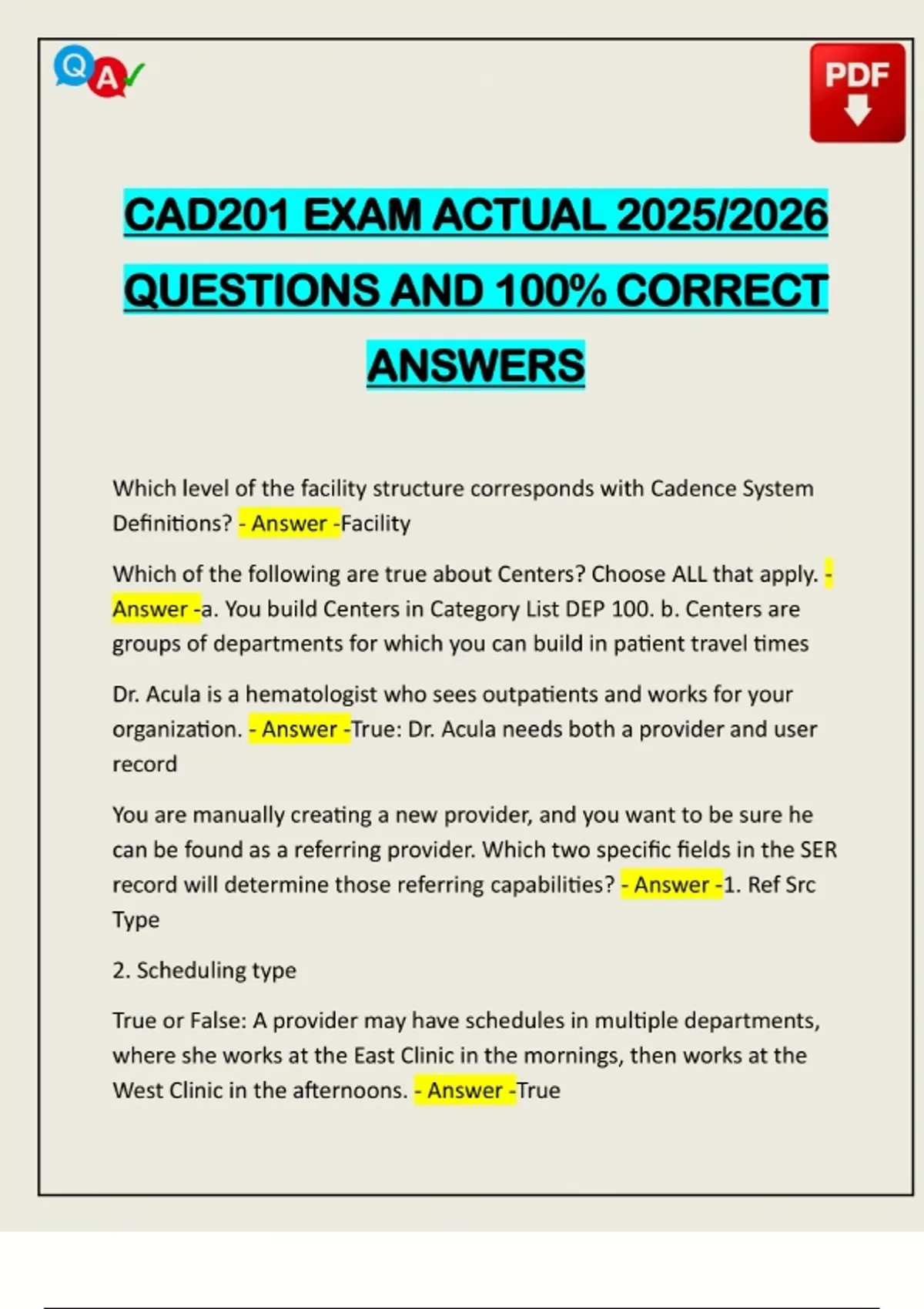CAD201 EXAM ACTUAL 2025/2026 QUESTIONS AND 100% CORRECT ANSWERS Which level of the facility structure corresponds with Cadence System Definitions? - Answer -Facility Which of the following are true about Centers? Choose ALL that apply. - Answer -a. You build Centers in Category List DEP 100. b. Centers are groups of departments for which you can build in patient travel times Dr. Acula is a hematologist who sees outpatients and works for your organization. - Answer -True: Dr. Acula needs both a provider and user record You are manually creating a new provider, and you want to be sure he can be found as a referring provider. Which two specific fields in the SER record will determine those referring capabilities? - Answer -1. Ref Src Type 2. Scheduling type