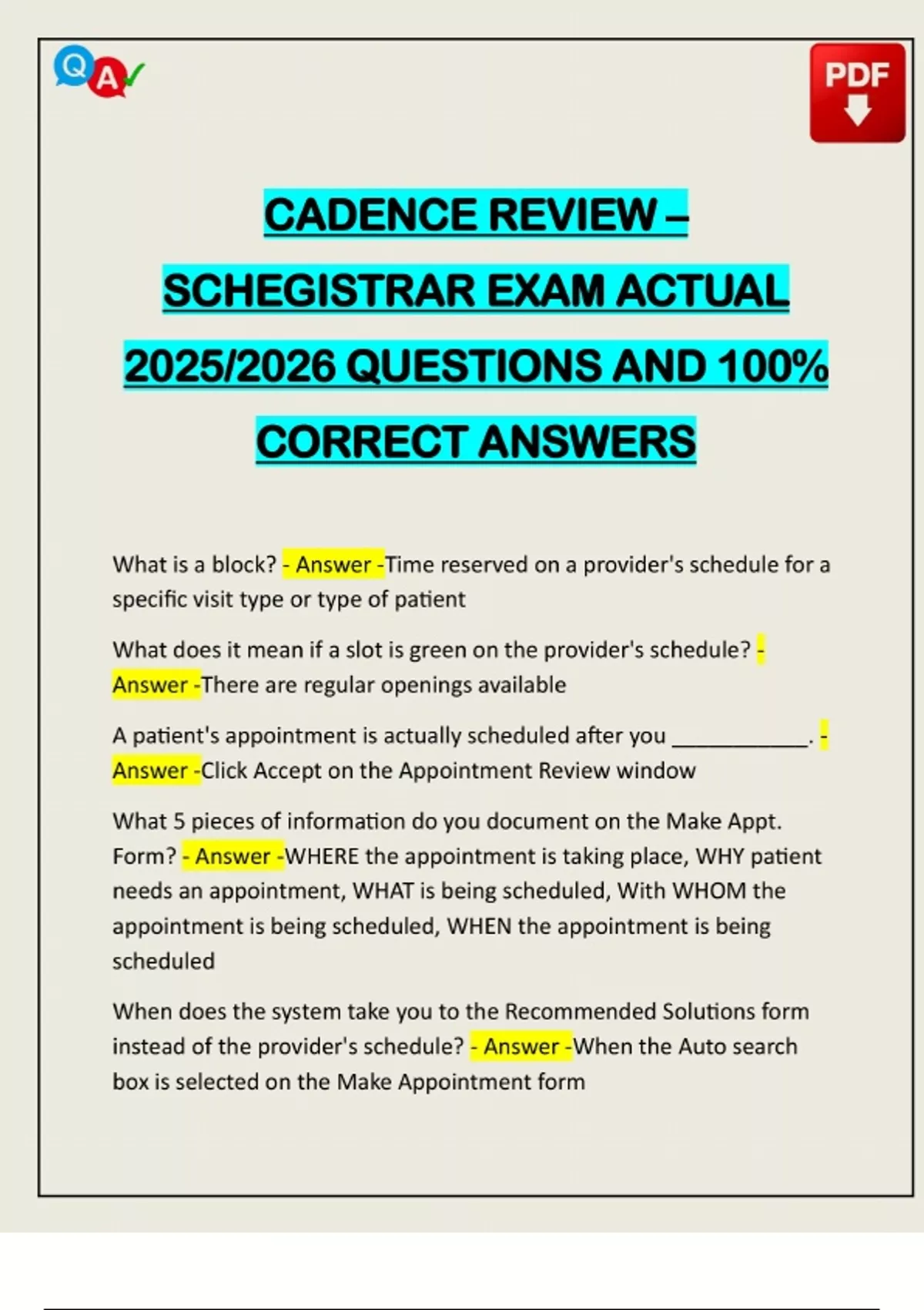 CADENCE REVIEW – SCHEGISTRAR EXAM ACTUAL 2025/2026 QUESTIONS AND 100% CORRECT ANSWERS What is a block? - Answer -Time reserved on a provider's schedule for a specific visit type or type of patient What does it mean if a slot is green on the provider's schedule? - Answer -There are regular openings available A patient's appointment is actually scheduled after you ___________. - Answer -Click Accept on the Appointment Review window What 5 pieces of information do you document on the Make Appt. Form? - Answer -WHERE the appointment is taking place, WHY patient needs an appointment, WHAT is being scheduled, With WHOM the appointment is being scheduled, WHE
