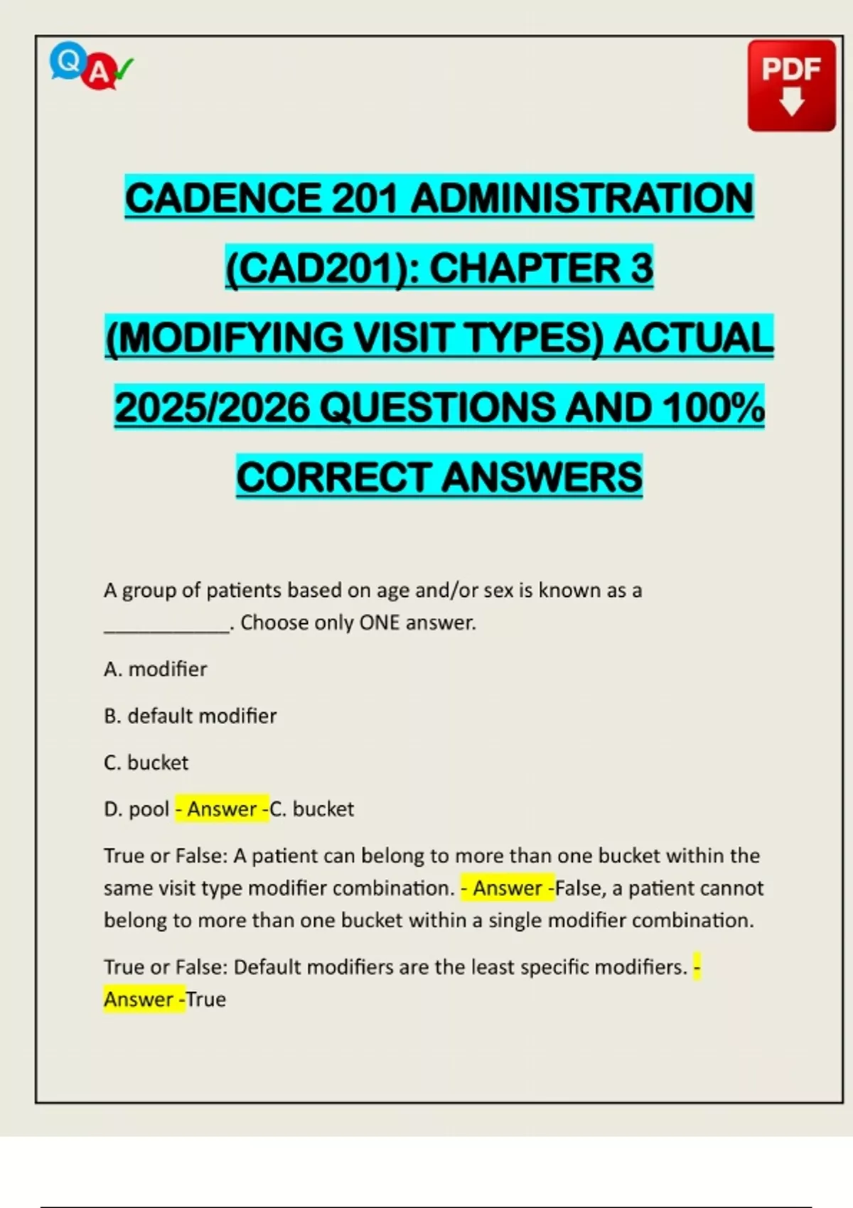 CADENCE 201 ADMINISTRATION (CAD201): CHAPTER 3 (MODIFYING VISIT TYPES) ACTUAL 2025/2026 QUESTIONS AND 100% CORRECT ANSWERS A group of patients based on age and/or sex is known as a ___________. Choose only ONE answer. A. modifier B. default modifier C. bucket D. pool - Answer -C. bucket True or False: A patient can belong to more than one bucket within the same visit type modifier combination. - Answer -False, a patient cannot belong to more than one bucket within a single modifier combination. True or False: Default modifiers are the least specific modifiers. - Answer -TrueNeed assistance in Online classes, Exams & Assignments? Reach out for Full Course Assistance, Plagiarism-free Essay Writing, Research Paper & Discussion Posts. Confidential & Secure! Email now at: True or False: Patient modifiers are configured within the visit type record. - Answer -False, patient modifiers are configured within the patient record. For which of the following reasons would you bui