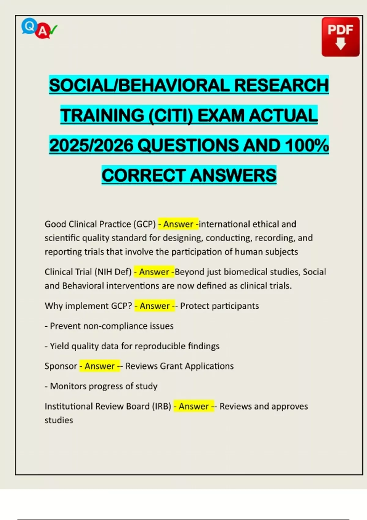 SOCIAL/BEHAVIORAL RESEARCH TRAINING (CITI) EXAM ACTUAL 2025/2026 QUESTIONS AND 100% CORRECT ANSWERS Good Clinical Practice (GCP) - Answer -international ethical and scientific quality standard for designing, conducting, recording, and reporting trials that involve the participation of human subjects Clinical Trial (NIH Def) - Answer -Beyond just biomedical studies, Social and Behavioral interventions are now defined as clinical trials. Why implement GCP? - Answer -- Protect participants - Prevent non-compliance issues - Yield quality data for repro