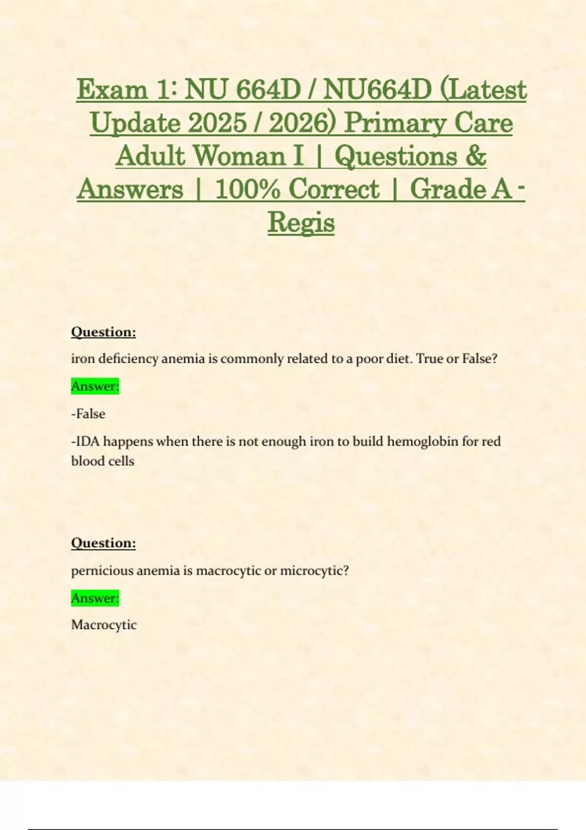 Exam 1: NU 664D / NU664D (Latest Update 2025 / 2026) Primary Care Adult Woman I | Questions & Answers | 100% Correct | Grade A - Regis Question: iron deficiency anemia is commonly related to a poor diet. True or False? Answer: -False -IDA happens when there is not enough iron to build hemoglobin for red blood cells Question: pernicious anemia is macrocytic or microcytic? Answer: Macrocytic