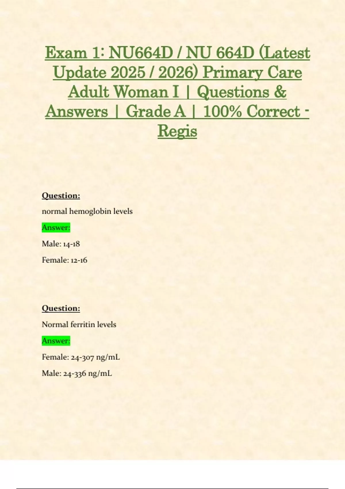 Exam 1: NU664D / NU 664D (Latest Update 2025 / 2026) Primary Care Adult Woman I | Questions & Answers | Grade A | 100% Correct - Regis Question: normal hemoglobin levels Answer: Male: 14-18 Female: 12-16 Question: Normal ferritin levels Answer: Female: 24-307 ng/mL Male: 24-336 ng/mL Question: normal hematocrit levels Answer: Male: 42-50% Female: 37-47%