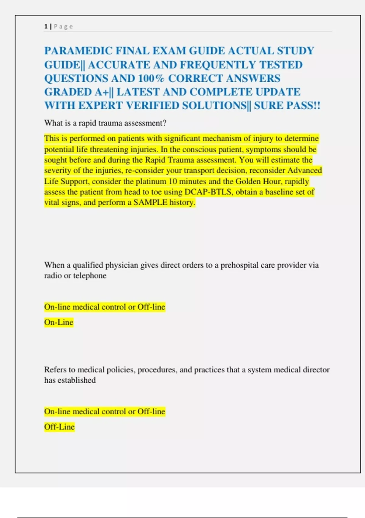 PARAMEDIC FINAL EXAM GUIDE ACTUAL STUDY GUIDE|| ACCURATE AND FREQUENTLY TESTED QUESTIONS AND 100% CORRECT ANSWERS GRADED A+|| LATEST AND COMPLETE UPDATE WITH EXPERT VERIFIED SOLUTIONS|| SURE PASS!!