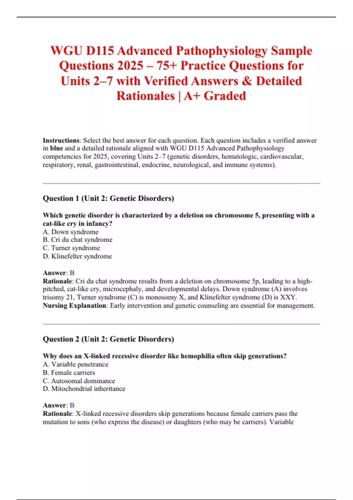 WGU D115 Advanced Pathophysiology Sample Questions 2025 – 75+ Practice Questions for Units 2–7 with Verified Answers & Detailed Rationales | A+ Graded