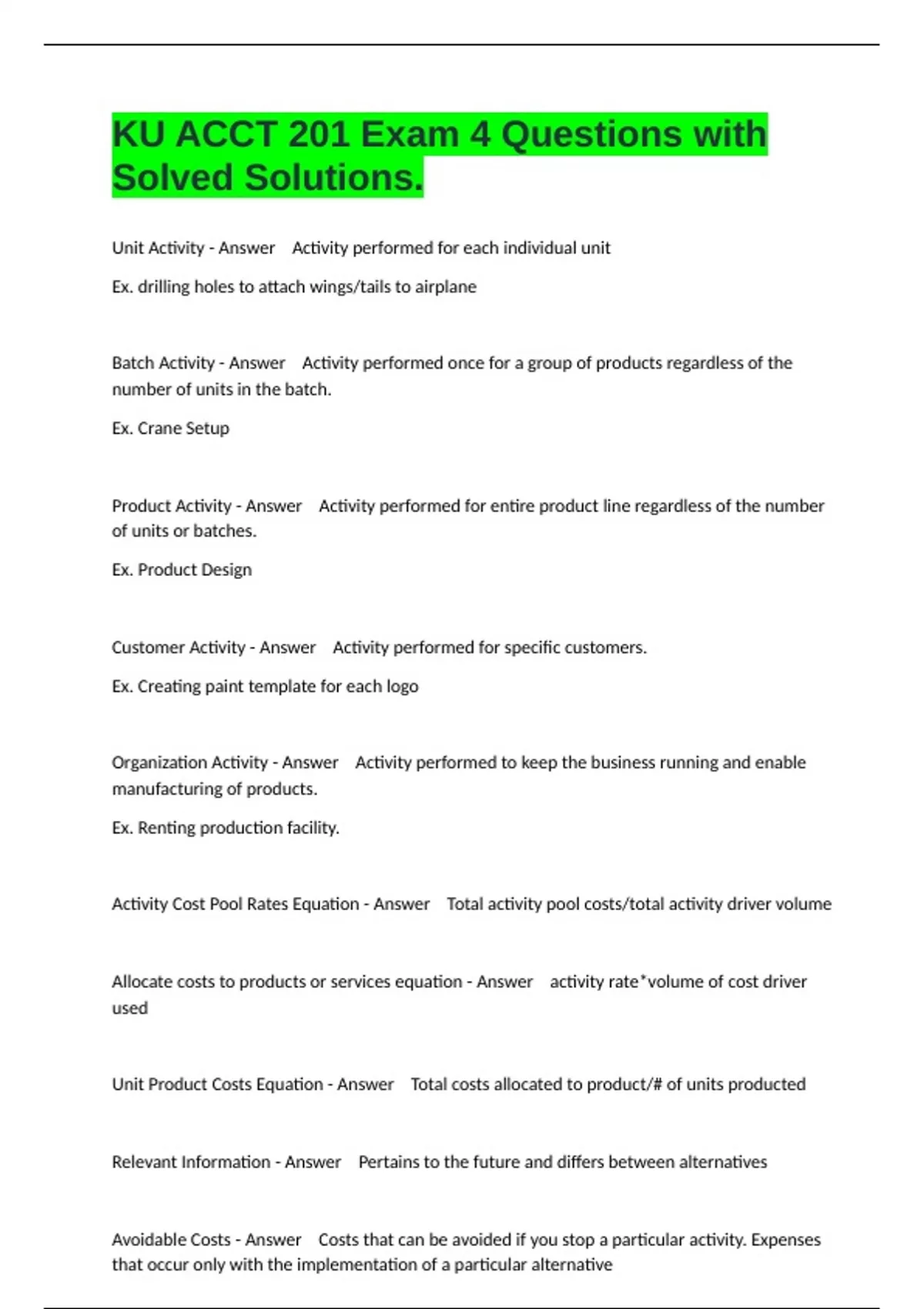 Unit Activity - Answer Activity performed for each individual unit Ex. drilling holes to attach wings/tails to airplane Batch Activity - Answer Activity performed once for a group of products regardless of the number of units in the batch. Ex. Crane Setup Product Activity - Answer Activity performed for entire product line regardless of the number of units or batches. Ex. Product Design Customer Activity - Answer Activity performed for specific customers. Ex. Creating paint template for each logo Organization Activity - Answer Activity performed to keep the business running and enable manufacturing of products. Ex. Renting production facility. Activity Cost Pool Rates Equation - Answer Total activity pool costs/total activity driver volume Allocate costs to products or services equation - Answer activity rate*volume of cost driver used Unit Product Costs Equation - Answer Total costs allocated to product/# of units producted Relevant Information - Answer Pertains to the future and differs between alternatives Avoidable Costs - Answer Costs that can be avoided if you stop a particular activity. Expenses that occur only with the implementation of a particular alternative Sunk Costs - Answer Costs incurred in the past that cannot be changed regardless of future action