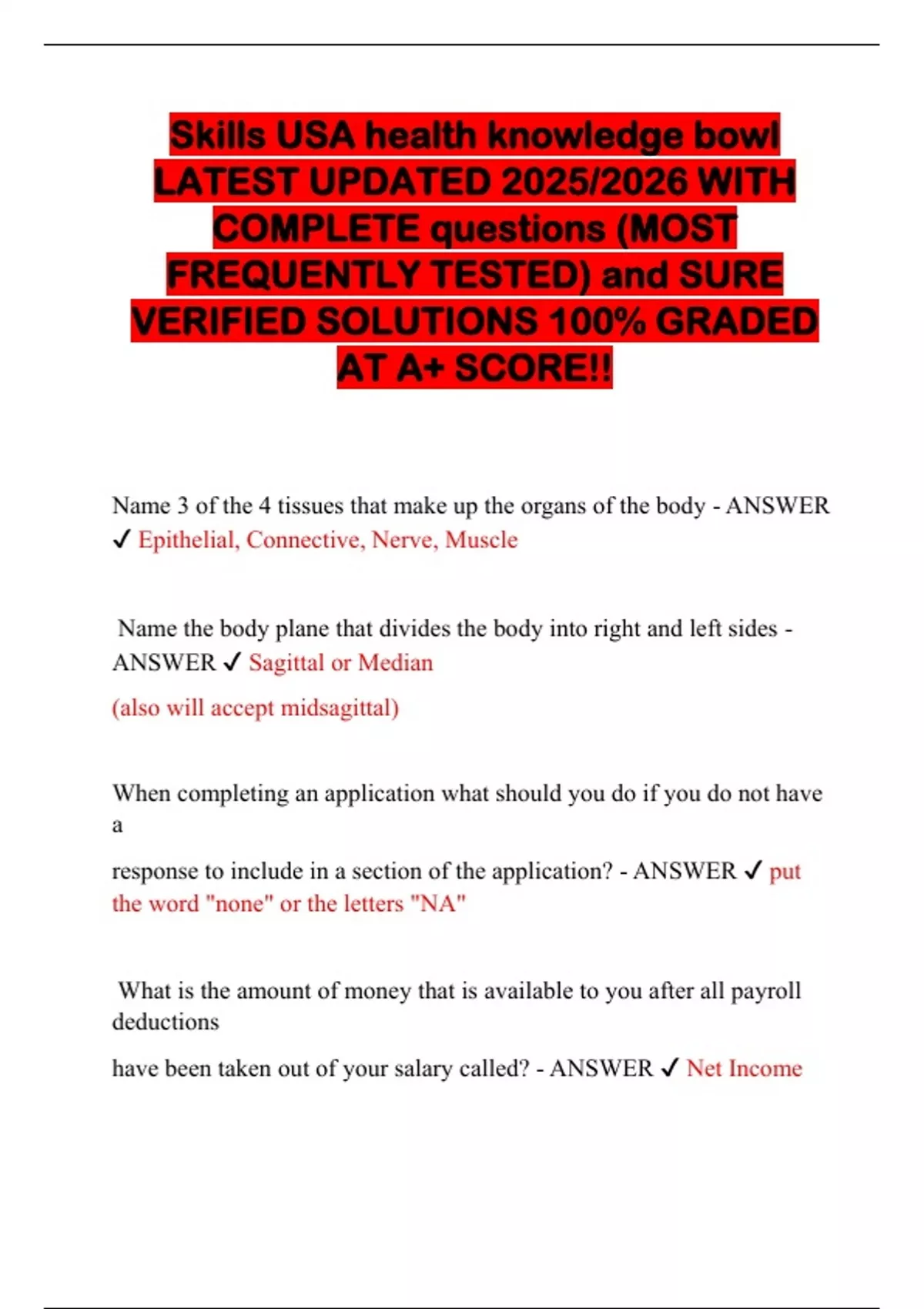Skills USA health knowledge bowl LATEST UPDATED 2025/2026 WITH COMPLETE questions (MOST FREQUENTLY TESTED) and SURE VERIFIED SOLUTIONS 100% GRADED AT A+ SCORE!! Name 3 of the 4 tissues that make up the organs of the body - ANSWER Epithelial, Connective, Nerve, Muscle Name the body plane that divides the body into right and left sides - ANSWER Sagittal or Median (also will accept midsagittal) When completing an application what should you do if you do not have a response to include in a section of the application? - ANSWER put the word "none" or the letters "NA" What is the amount of money that is available to you after all payroll deductions have been taken out of your salary called? - ANSWER Net Income Many health careers require that students complete an educational program, pass a state board exam, and may require that those certain standards be maintained. Upon successful completion of the state board exam the student will receive what credential? - ANSWER License What is an advance directive that designates a person to make health care decisions when the person is unable to make decisions for himself? - ANSWER Durable Power of Attorney for Health Care What is the legal term for permission granted voluntarily by a person who is of sound mind after the procedure and all the risks have been explained in terms the person can understand? - ANSWER Informed Consent Which body system performs the following functions: framework for the body, protection for internal structures, storage area for calcium, and produces blood cells? - ANSWER Skeletal Name the two major organs located in the thoracic cavity. - ANSWER Lungs and Heart (would accept large blood vessels as an option) Name the disease process that is characterized by softening or increased porosity of the bones which causes them to break more easily. It is often seen more often in postmenopausal women due to the decrease in estrogen production. - ANSWER Osteoporosis Which type of muscle tissue makes up the muscles of the body that are voluntary? - ANSWER Skeletal or Sriated Skeletal muscles may move a body part away from the midline of the body. What is this movement called? - ANSWER Abduction or to Abduct What is the medical term for the tissue that makes up the thick middle layer of the heart? - ANSWER Myocardium Name the type of blood vessel that has a thin (one cell layer thick) wall that allows for the exchange of oxygen, nutrients, carbon dioxide and metabolic products. - ANSWER Capillaries Name the value in the heart that prevents the backflow of blood from the right ventricle into the right atrium? - ANSWER Tricuspid or Right AV Valve Name the structure of the lungs that allows the exchange of oxygen and carbon dioxide between the lungs and the capillaries surrounding these structures. - ANSWER Alveoli The small intestine is approximately 20 feet in length. What is the name given to the first 10 inches (approximately) of the small intestine? - ANSWER Duodenum Name the four primary structures that make up the urinary system - ANSWER Kidneys, Urinary Bladder (or just Bladder), Ureters, and Urethra Name the disease process that is characterized by impaired production of insulin by the pancreas which results in hyperglycemia. - ANSWER Diabetes The nervous system is divided into two parts. Name the part that includes the brain and the spinal cord. - ANSWER Central Nervous System Name the gonads for both the male and female reproductive systems. - ANSWER Testes and Ovaries Facial expressions such as a frown or a scowl are examples of what type of communication? - ANSWER Nonverbal Name three things that will promote Active listening or "good" listening skills. - ANSWER Show interest, "hear" the message by repeating what you think you heard, allow the sender to give the entire message (do not interrupt), patience, eye contact, be at the same level as the sender, etc. State the three essential elements to communication. - ANSWER Message, Sender, Receiver When documenting on the medical record the health care worker write observations that can be seen, heard, felt, smelled or otherwise measured by all who make the observation. What type of observation are these? - ANSWER Objective Describe the proper way to sign an entry in the medical record. - ANSWER first initial, last name, and your title Write the proper medical term for the surgical removal of the uterus. - ANSWER Hysterectomy Write the proper medical term for hardening of an artery - ANSWER arteriosclerosis Write the proper medical term for the recording of the electrical impulses of the brain - ANSWER Electroencephalograph or Electroencephalogram Write the proper medical term for enlargement of the liver and spleen - ANSWER hepatosplenomegaly Write the medical abbreviation for after meals - ANSWER pc Write the medical abbreviation for three times a day - ANSWER tid Write the meaning of the medical abbreviation "prn". - ANSWER whenever necessary or as needed What is the term for a graphic that shows how each department fits into the system and identifies the line of authority within the health care facility called? - ANSWER Organizational Chart What is the name of the federal government method of reimbursing health care facilities for medicare and medicaide expenses, established in 1983 to attempt to contain the cost of health care. Under this plan reimbursement is based on an approved grouping of medical conditions, the reasonable cost for each condition, and its standard treatment. (Do not use the abbreviation) - ANSWER Diagnostic Related Groups What is the primary purpose of a letter of application or a cover letter? - ANSWER To obtain an interview On the application the applicant will list people the employer may contact to validate the honesty and accuracy of the resume' and application. What are these people called? - ANSWER References What is the legal term for writing defamatory matters about an individual or a group? - ANSWER Libel What is the legal term for failing to co