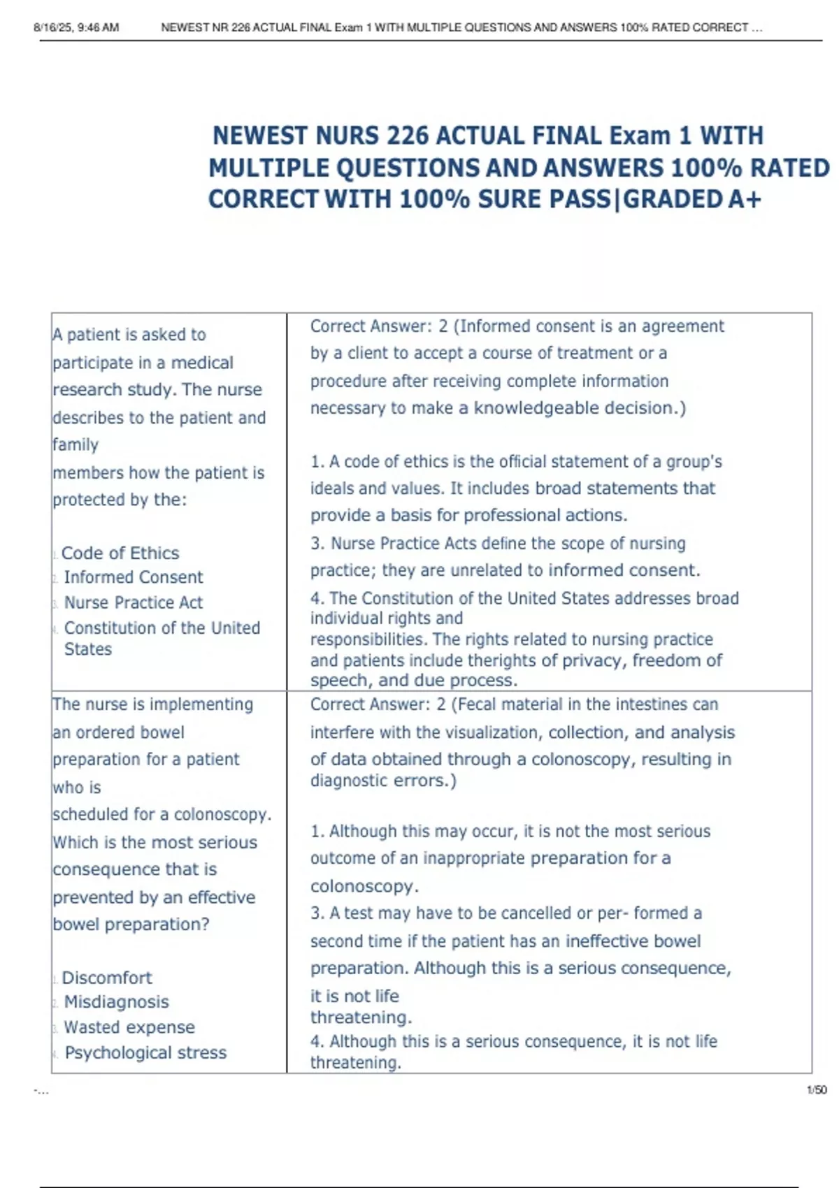 , 8/16/25, 9:46 AM NEWEST NR 226 ACTUAL FINAL Exam 1 WITH MULTIPLE QUESTIONS AND ANSWERS 100% RATED CORRECT …