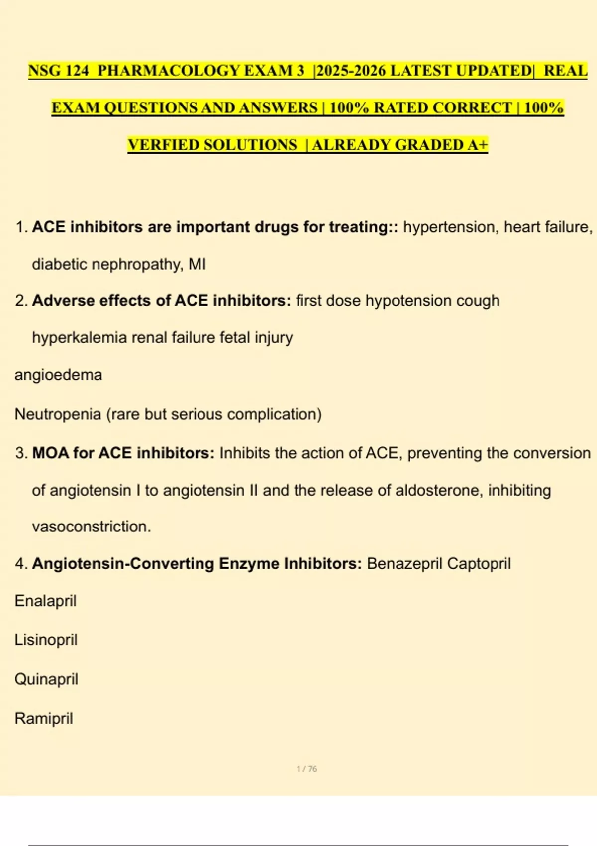 1. ACE inhibitors are important drugs for treating:: hypertension, heart failure,