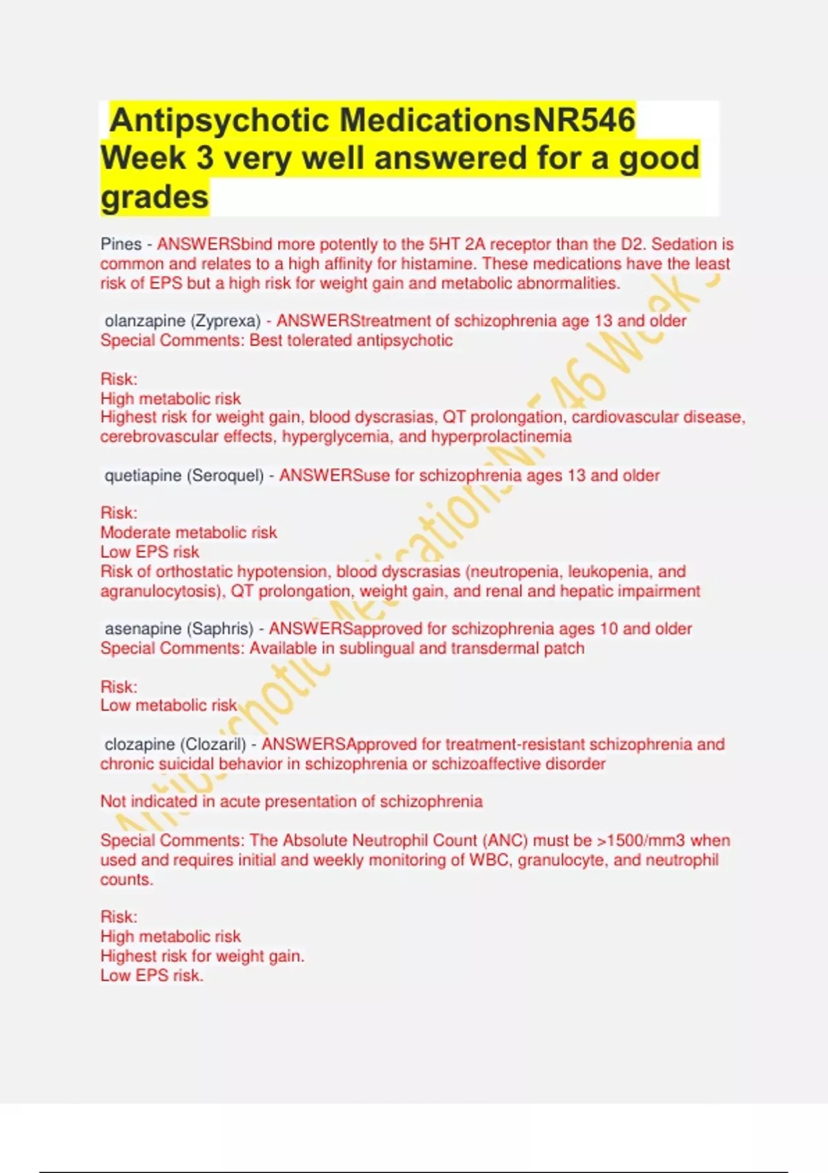 clozapine (Clozaril) - ANSWERSApproved for treatment-resistant schizophrenia and