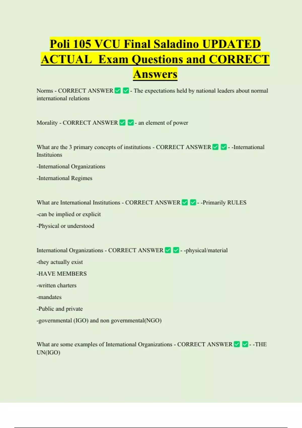 Poli 105 VCU Final Saladino UPDATED ACTUAL Exam Questions and CORRECT Answers Norms - CORRECT ANSWER international relations Morality - CORRECT ANSWER - The expectations held by national leaders about normal - an element of power What are the 3 primary concepts of institutions - CORRECT ANSWER Instituions -International Organizations -International Regime