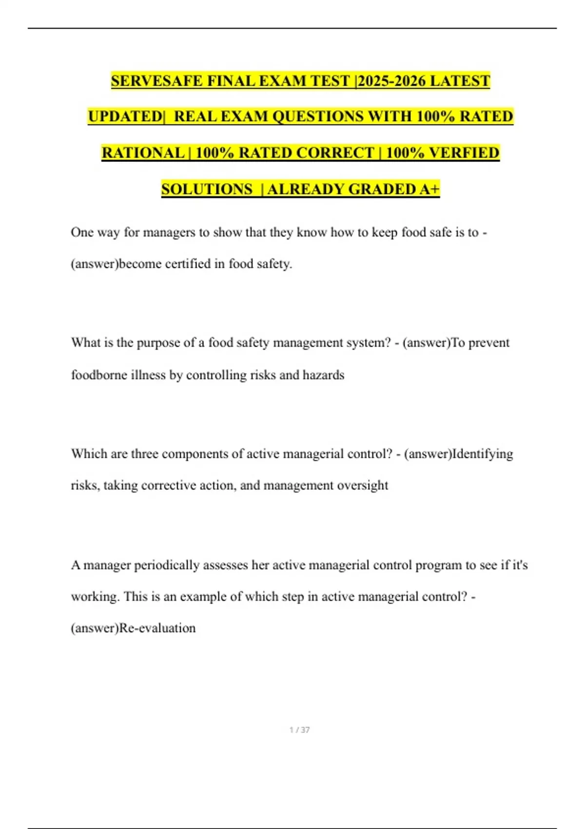 SERVESAFE FINAL EXAM TEST | LATEST UPDATED| REAL EXAM QUESTIONS WITH 100% RATED RATIONAL | 100% RATED CORRECT | 100% VERFIED SOLUTIONS | ALREADY GRADED A+