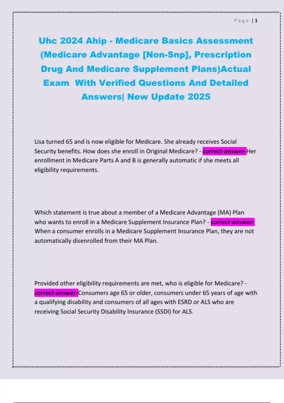 Prepare effectively for the UHC 2024 AHIP Medicare Basics Assessment with this comprehensive resource featuring 70 verified questions and answers. Updated for the 2025 testing cycle, this guide covers essential topics such as Medicare Advantage (non-SNP), Prescription Drug Plans, and Medicare Supplement Plans. Ideal for insurance agents and healthcare professionals seeking to enhance their knowledge and pass the assessment with confidence.
