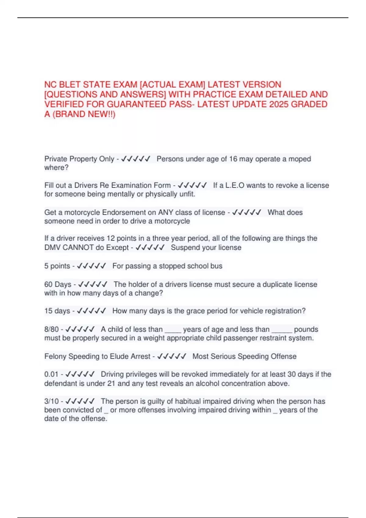NC BLET state exam [ACTUAL EXAM] LATEST VERSION [QUESTIONS AND ANSWERS] WITH PRACTICE EXAM DETAILED AND VERIFIED FOR GUARANTEED PASS- LATEST UPDATE 2025 GRADED A (BRAND NEW!!)