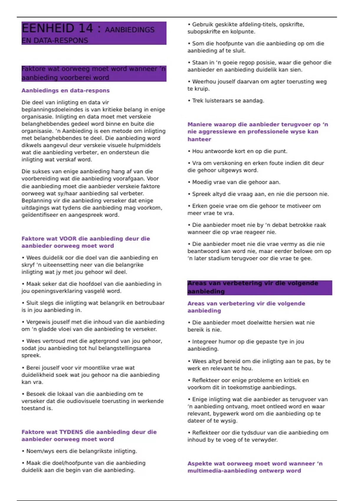 My studienotas is sorgvuldig opgestel om ’n duidelike en omvattende oorsig van die materiaal te bied. Elke onderwerp word in goed georganiseerde afdelings verdeel, wat dit maklik maak om te volg en te verstaan. Die notas is bondig maar deeglik, wat sleutelkonsepte in detail dek sonder om die leser oorweldig. Ek gebruik presiese taal en duidelike verduidelikings om te verseker dat die inhoud beide toeganklik en boeiend is. Goed navors en akkuraat, my notas bied waardevolle insigte en voorbeelde wat studente help om selfs die mees komplekse idees te begryp. Dit is ontwerp om so effektief as moontlik te wees, en is ’n noodsaaklike bron vir enigeen wat in hul studies wil slaag.