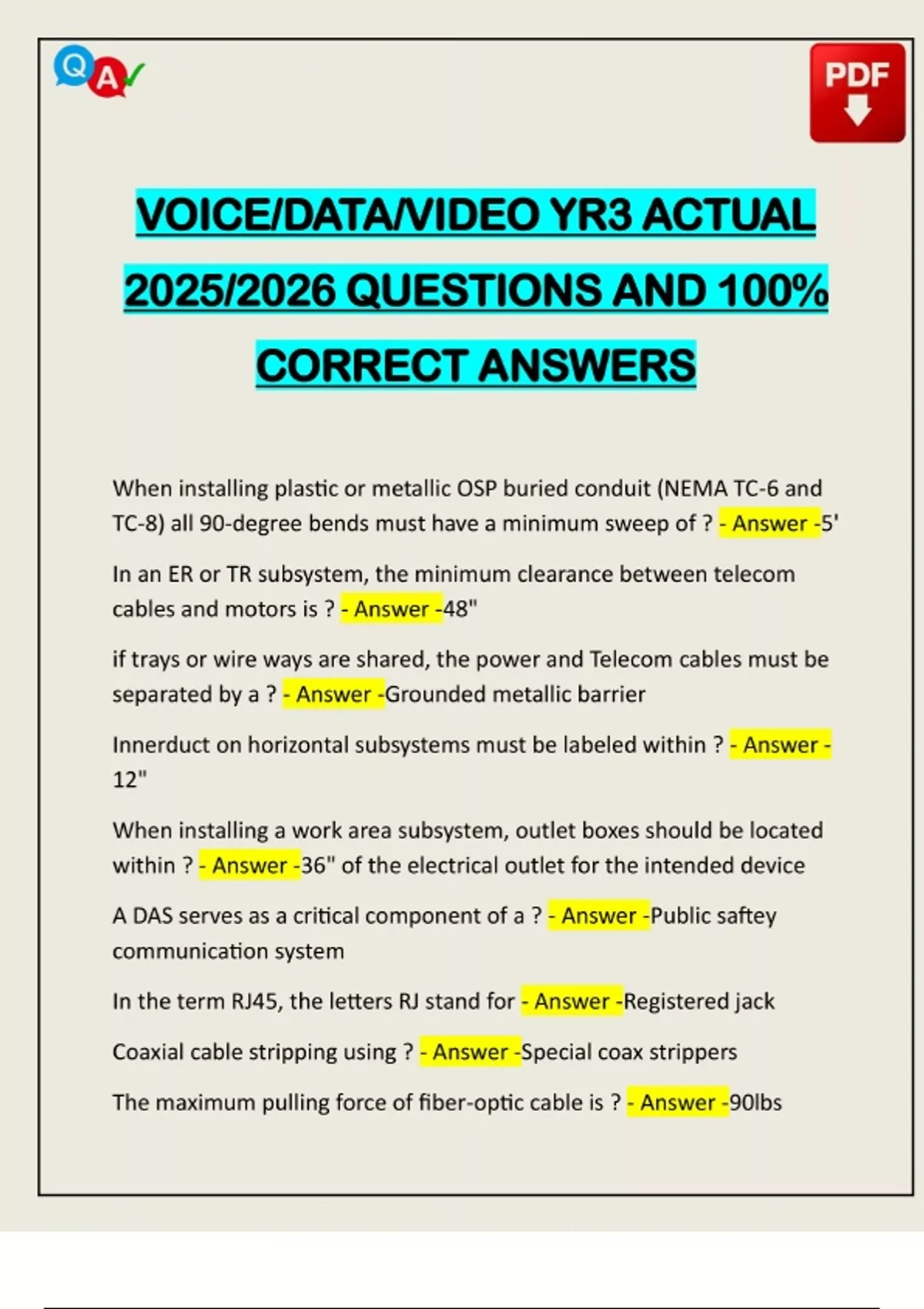 VOICE/DATA/VIDEO YR3 ACTUAL 2025/2026 QUESTIONS AND 100% CORRECT ANSWERS When installing plastic or metallic OSP buried conduit (NEMA TC-6 and TC-8) all 90-degree bends must have a minimum sweep of ? - Answer -5' In an ER or TR subsystem, the minimum clearance between telecom cables and motors is ? - Answer -48" if trays or wire ways are shared, the power and Telecom cables must be separated by a ? - Answer -Grounded metallic barrier Innerduct on horizontal subsystems must be labeled within ? - Answer - 12