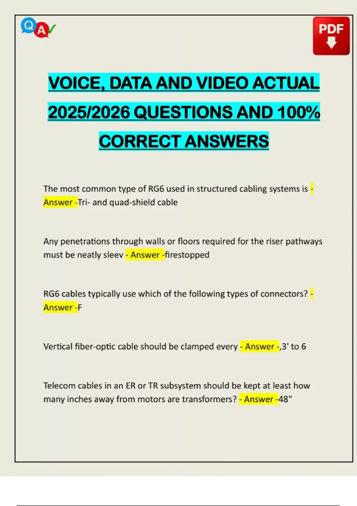 VOICE, DATA AND VIDEO ACTUAL 2025/2026 QUESTIONS AND 100% CORRECT ANSWERS The most common type of RG6 used in structured cabling systems is - Answer -Tri- and quad-shield cable Any penetrations through walls or floors required for the riser pathways must be neatly sleev - Answer -firestopped RG6 cables typically use which of the following types of connectors? - Answer -F