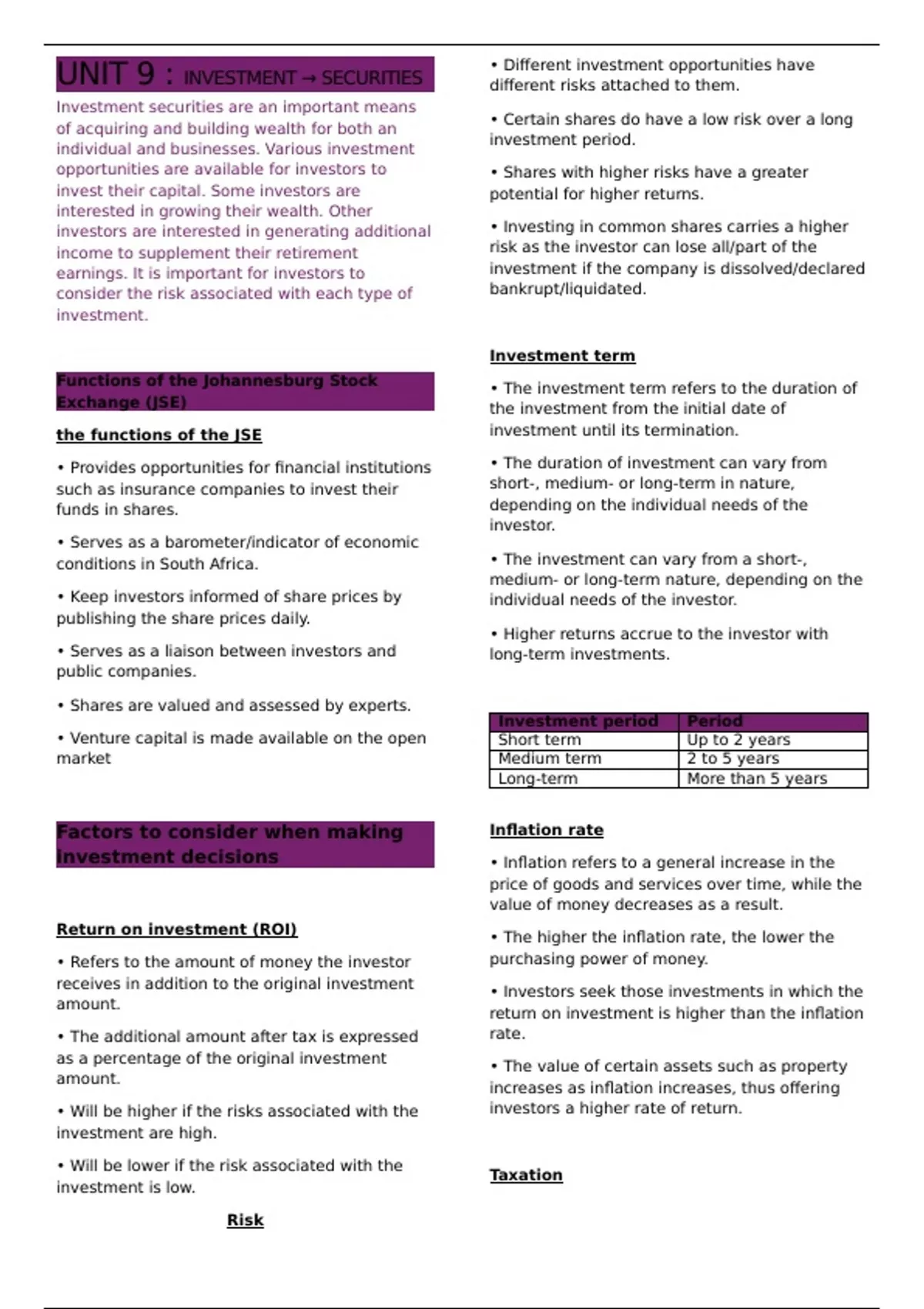 Functions of the Johannesburg Stock • The investment term refers to the duration of