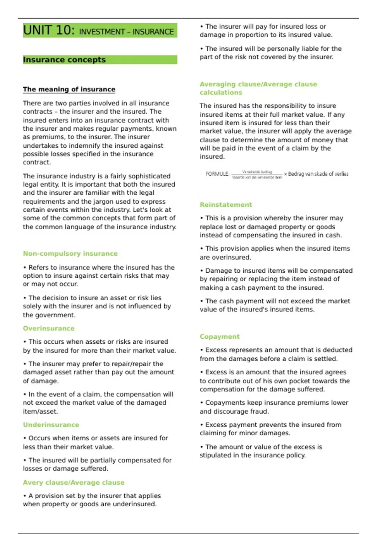 UNIT 10: INVESTMENT – INSURANCE • The insurer will pay for insured loss or