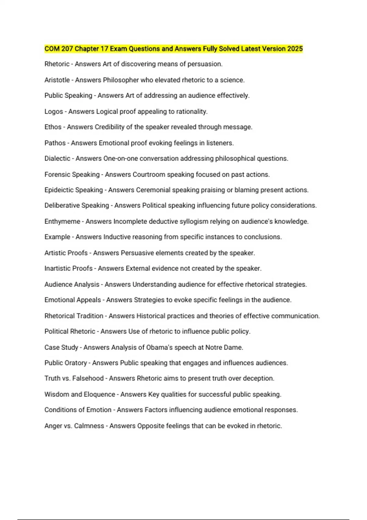 COM 207 Chapter 17 Exam Questions and Answers Fully Solved Latest Version 2025 Rhetoric - Answers Art of discovering means of persuasion. Aristotle - Answers Philosopher who elevated rhetoric to a science. Public Speaking - Answers Art of addressing an audience effectively. Logos - Answers Logical proof appealing to rationality. Ethos - Answers Credibility of the speaker revealed through message. Pathos - Answers Emotional proof evoking feelings in listeners. Dialectic - Answers One-on-one conversation addressing philosophical questions. Forensic Speaking - Answers Courtroom speaking focused on past actions. Epideictic Speaking - Answers Ceremonial speaking praising or blaming present actions. Deliberative Speaking - Answers Political speaking influencing future policy considerations. Enthymeme - Answers Incomplete deductive syllogism relying on audience's knowledge. Example - Answers Inductive reasoning from specific instances to conclusions. Artistic Proofs - Answers Persuasive elements created by the speaker. Inartistic Proofs - Answers External evidence not created by the speaker. Audience Analysis - Answers Understanding audience for effective rhetorical strategies. Emotional Appeals - Answers Strategies to evoke specific feelings in the audience. Rhetorical Tradition - Answers Historical practices and theories of effective communication. Political Rhetoric - Answers Use of rhetoric to influence public policy. Case Study - Answers Analysis of Obama's speech at Notre Dame. Public Oratory - Answers Public speaking that engages and influences audiences. Truth vs. Falsehood - Answers Rhetoric aims to present truth over deception. Wisdom and Eloquence - Answers Key qualities for successful public speaking. Conditions of Emotion - Answers Factors influencing audience emotional responses. Anger vs. Calmness - Answers Opposite feelings that can be evoked in rhetoric.