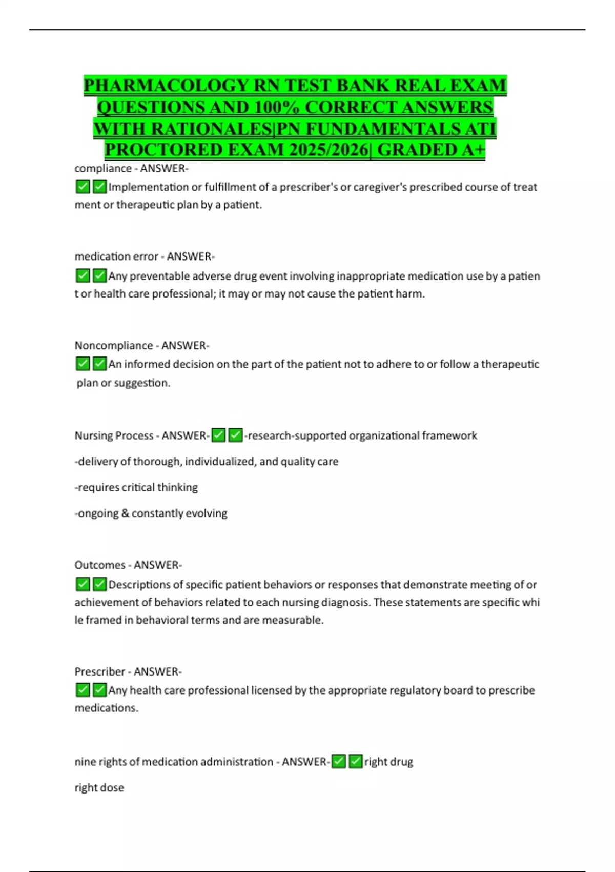 PHARMACOLOGY RN TEST BANK REAL EXAM QUESTIONS AND 100% CORRECT ANSWERS WITH RATIONALES|PN FUNDAMENTALS ATI PROCTORED EXAM 2025/2026| GRADED A+