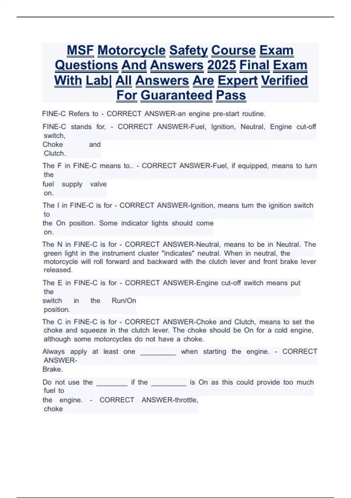 MSF Motorcycle Safety Course Exam Questions And Answers 2025 Final Exam With Lab| All Answers Are Expert Verified For Guaranteed Pass
