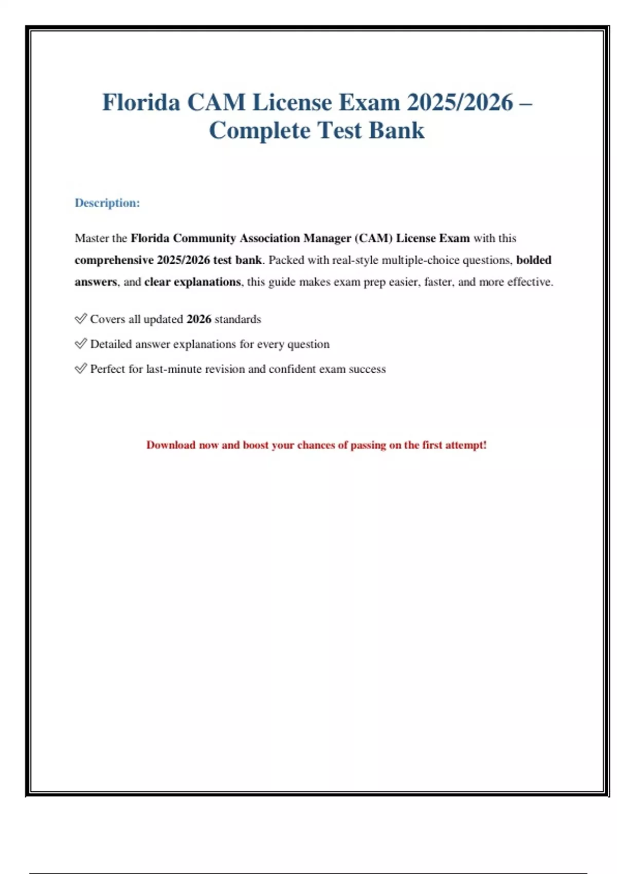 Master the Florida Community Association Manager (CAM) License Exam with this comprehensive 2025/2026 test bank. Packed with real-style multiple-choice questions, bolded answers, and clear explanations, this guide makes exam prep easier, faster, and more effective. Covers all updated 2026 standards Detailed answer explanations for every question Perfect for last-minute revision and confident exam success