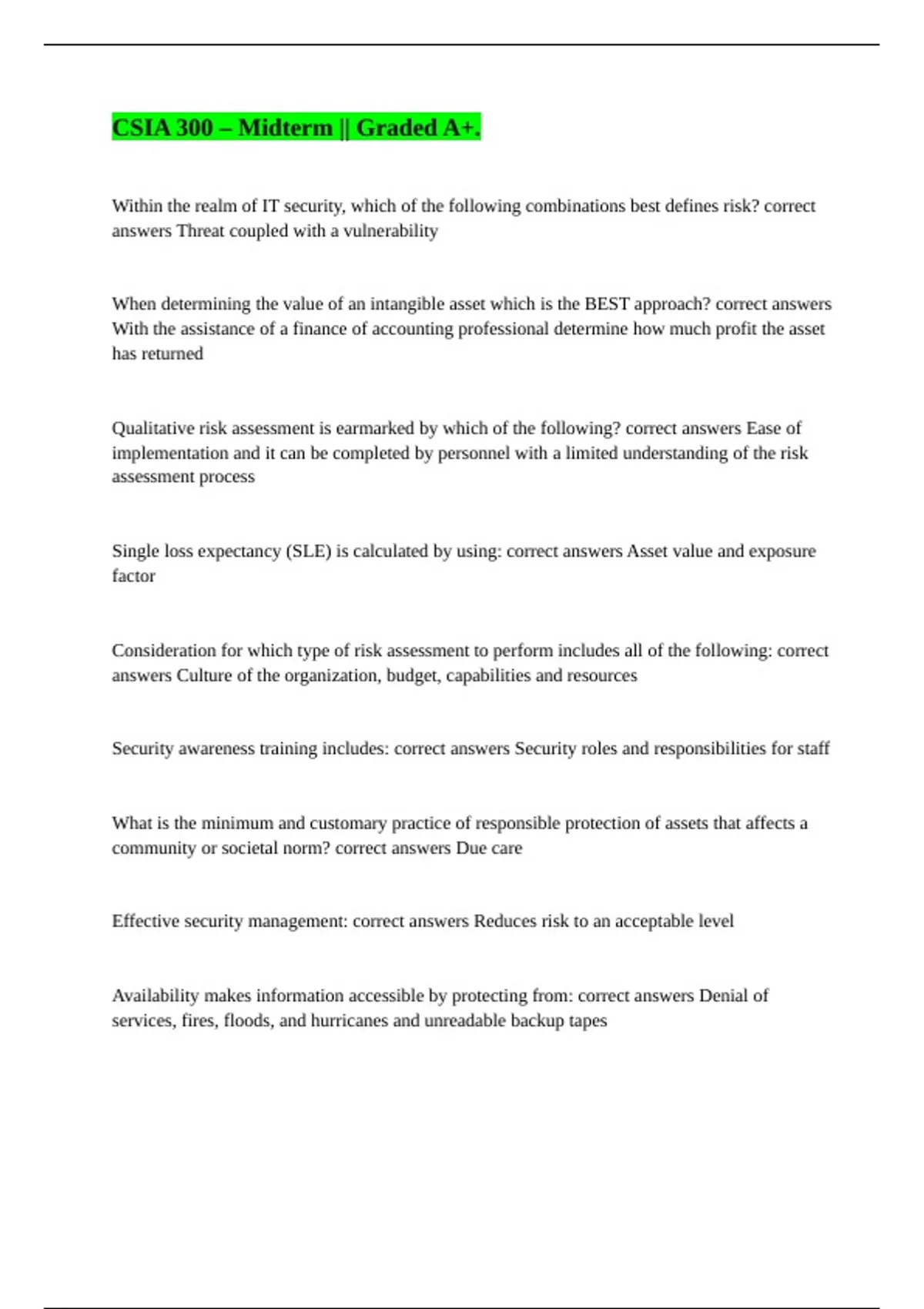 Effective security management: correct answers Reduces risk to an acceptable level