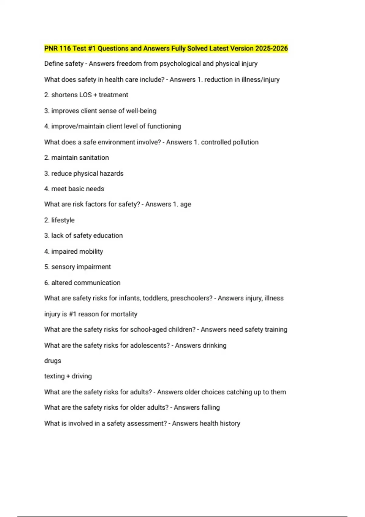 PNR 116 Test #1 Questions and Answers Fully Solved Latest Version Define safety - Answers freedom from psychological and physical injury What does safety in health care include? - Answers 1. reduction in illness/injury 2. shortens LOS + treatment 3. improves client sense of well-being 4. improve/maintain client level of functioning What does a safe environment involve? - Answers 1. controlled pollution 2. maintain sanitation 3. reduce physical hazards 4. meet basic needs What are risk factors for safety? - Answers 1. age 2. lifestyle 3. lack of safety education 4. impaired mobility 5. sensory impairment 6. altered communication What are safety risks for infants, toddlers, preschoolers? - Answers injury, illness injury is #1 reason for mortality What are the safety risks for school-aged children? - Answers need safety training What are the safety risks for adolescents? - Answers drinking drugs texting + driving What are the safety risks for adults? - Answers older choices catching up to them What are the safety risks for older adults? - Answers falling What is involved in a safety assessment? - Answers health history client's home environment health care environment risk for falls risk for medical errors client expectations What are nursing interventions for safety? - Answers client teaching for safety prevention of burns/scalds prevention of falls prevention of choking prevention of poisoning What is a restraint? - Answers any physical, chemical, or environmental device that limits mobility When are restraints appropriate? - Answers last resort with consent reduce injury prevent interruption of therapy confused or combative client removing life support reduce injury to others What are examples of physical restraints? - Answers belts safety straps mitts limb restraints mummy restraints side rails brakes What are some consequences of restraints? - Answers minimal movement constipation lack of appetite dehydration skin breakdown loss of independence strangulation What is the acronym for fire? - Answers R - rescue A - alarm